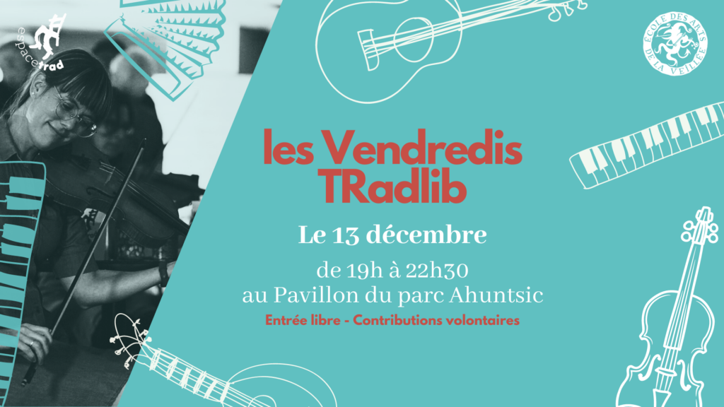 Le 13 décembre aura lieu la prochaine soirée des Vendredis TRadlib dans Ahuntsic-Cartierville. Ces soirées sont un rassemblement de musicien(nes) débutant(es) ou confirmé(es) qui jouent ensemble, dans le partage et la convivialité. Ces soirées se déroulent en deux étapes : une session au ralenti suivie d’une plus rapide.