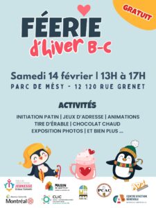 La Maison de quartier de Bordeaux-Cartierville organise un après-midi récréatif au parc de Mésy, le samedi 14 février, de 13h à 17h.