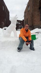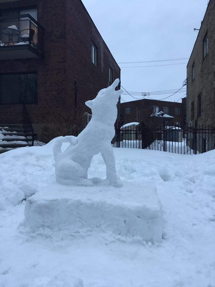 «En ce dimanche pluvieux et de neige collante, les activités peuvent sembler restreintes. J’ai tout de même pris mon courage à deux mains et je suis sortie. Depuis deux semaines je trépigne à l’idée de l’arrivée d’une rive mouillée pour aller faire bonhomme et sculpture. Résultat 2h30 plus tard : un coyote (très à la mode cette année) hurlant. Pas le plus beau et le plus parfait mais bien réussi. Des voisins se sont égayés devant le jeu hivernal et le résultat final. L’idée n’est donc venue : pourquoi St-sulpice ne ferait il pas un concours de sculptures? Ou que nos voisins n’en feraient pas eux aussi? C’est joyeux et met de la vie en plus d’être un bon point d’échanges entre voisins. Je me ferais même une joue ďaider ceux voulant participer.