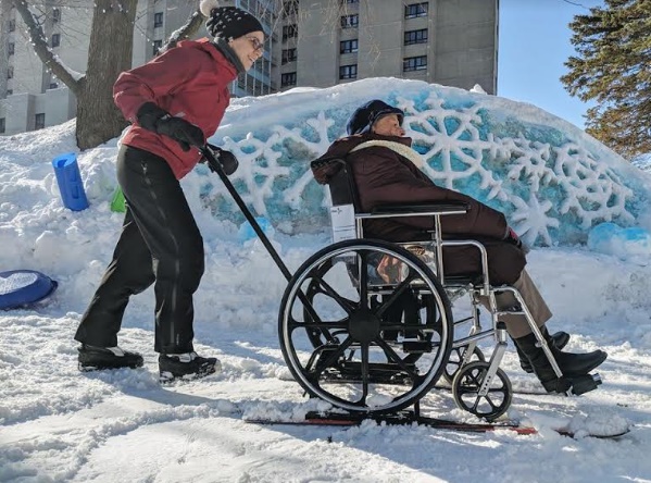 Les organisateurs (le Quartier et le CHSLD Berthiaume-Du Tremblay) avaient planifié l’ouverture d’un sentier entre le bâtiment du réseau de la Santé et la fameuse grotte afin de permettre la pratique du ski-fauteuil. Ainsi, une personne se trouve assise sur un fauteuil roulant dont les roues sont fixées à des skis. Pour se déplacer sur la neige vive, une personne n’a qu’à pousser le fauteuil.