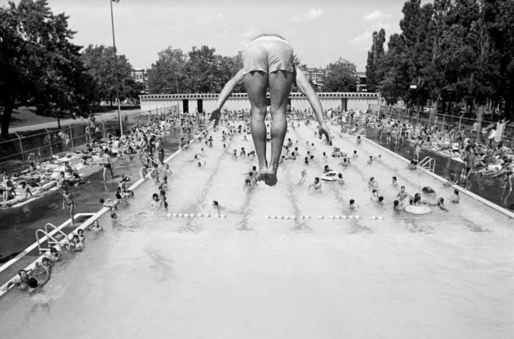 (Crédit-photo, également photo de la une: Jean-François LeBlanc. «Plongeon à la piscine du parc Laurier dans le quartier du Plateau Mont-Royal, un jour de canicule en juillet 1985»