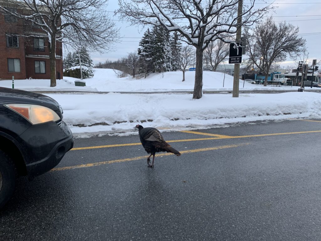 Consulté à ce sujet par le JDV, le Poste de quartier 27 affirme que la police n’est pas responsable des dindons sauvages. Le corps policier doit être sollicité uniquement en cas de collision avec un animal sauvage de plus de 25 kg. (Avez-vous une balance dans votre coffre d’auto, pour les peser en cas de collision?)
