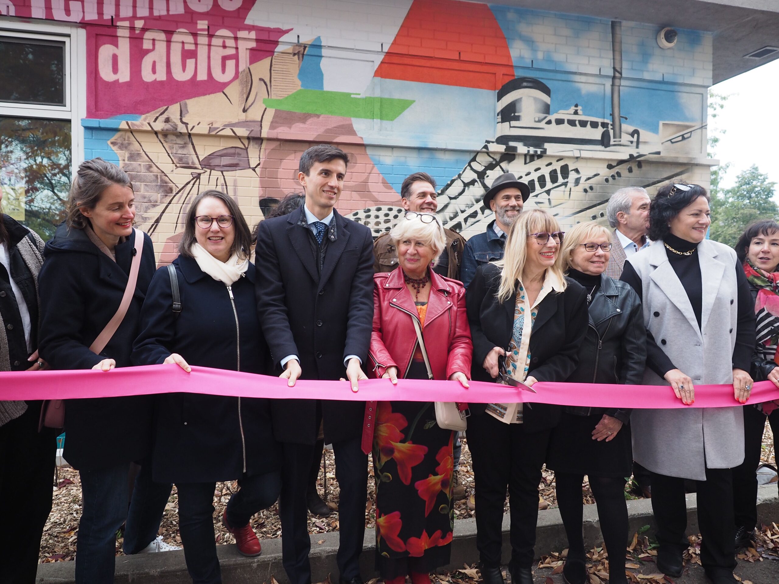 Le projet des Femmes d’acier ne s’arrête pas à la murale qui orne désormais le chalet du parc Saint-Simon-Apôtre et dont l’inauguration se tenait mercredi 18 octobre. Cette dernière constitue en effet la deuxième expression du projet. Les Femmes d’acier avaient en effet réalisé un collage monumental, en compagnie des artistes, plus tôt cette année au CFSE.