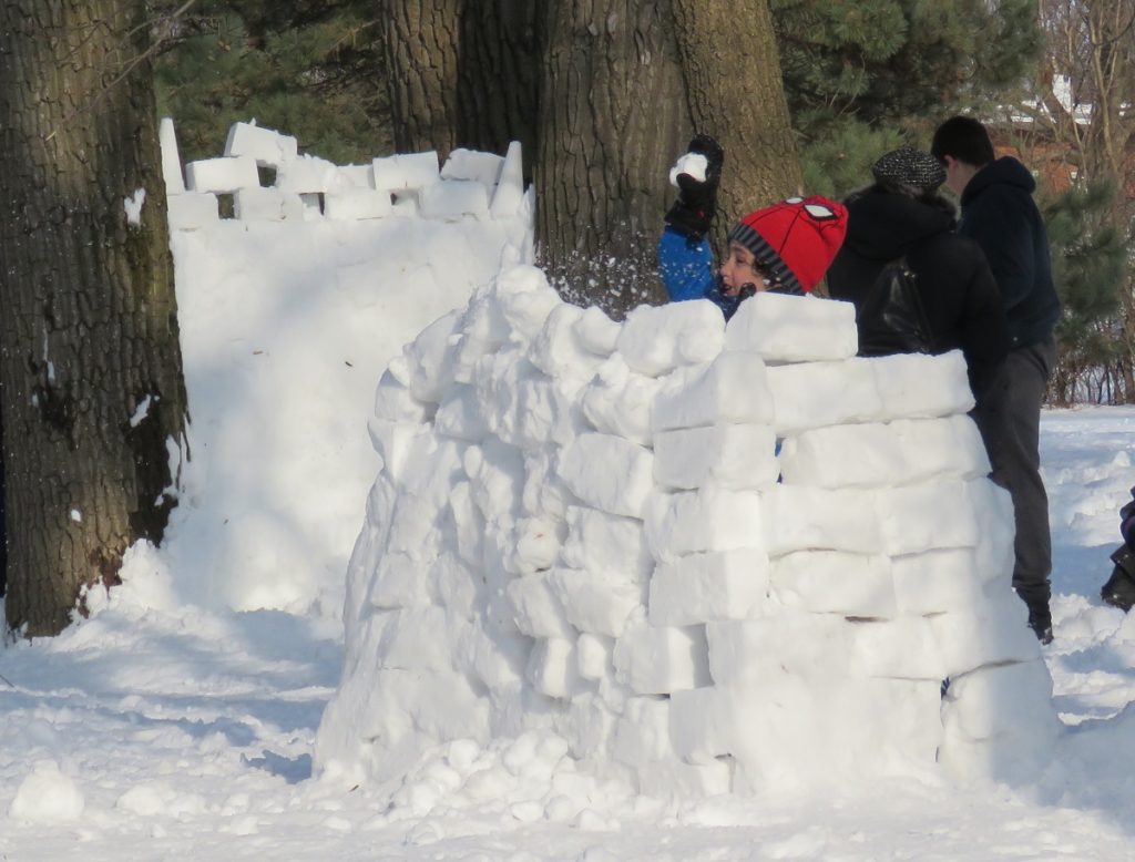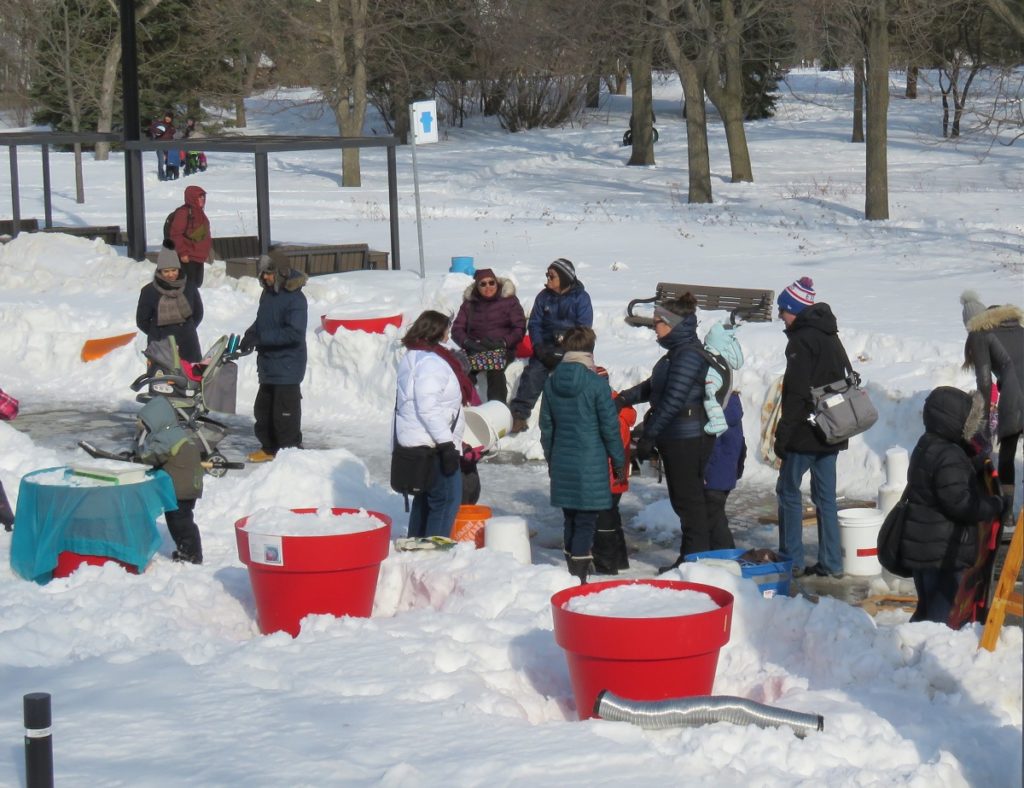 Construction de forts de neige lors de la Fête d’hiver d’Ahuntsic-Cartierville au Pavillon d’accueil du Pacours Gouin (Photo : jdv – Philippe Rachiele)