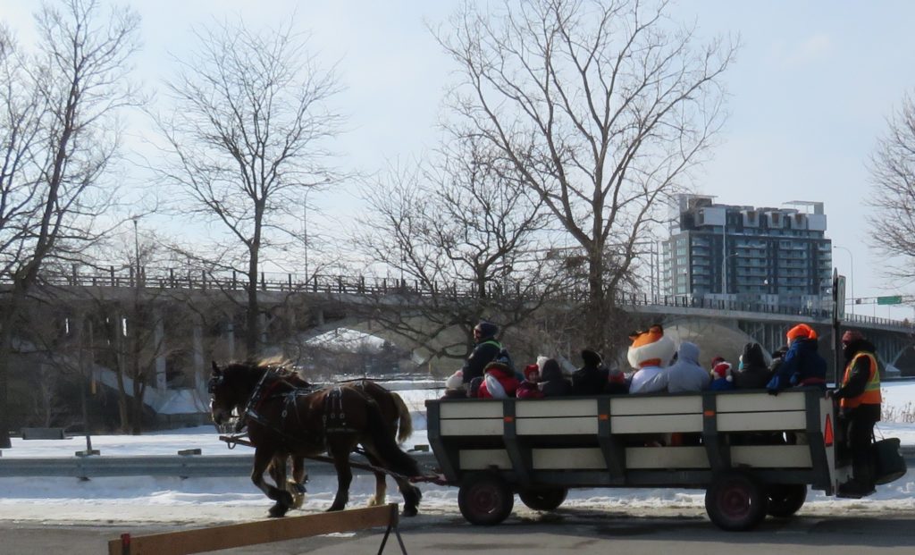 Promenade en carriole lors de la Fête d’hiver d’Ahuntsic-Cartierville au Pavillon d’accueil du Pacours Gouin (Photo : jdv – Philippe Rachiele)