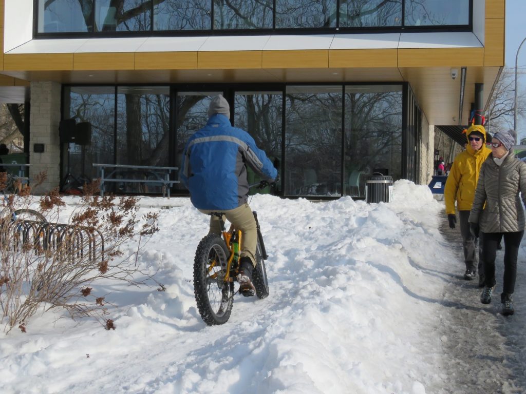 Essai de vélo surdimensionné (Fatbike) lors de la Fête d’hiver d’Ahuntsic-Cartierville au Pavillon d’accueil du Pacours Gouin (Photo : jdv – Philippe Rachiele)