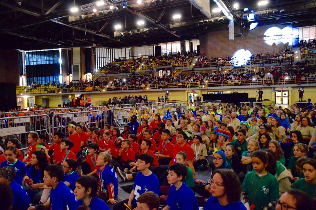 Après que tous les jeunes soient entrés sur le terrain multisport transformé en salle de spectacle, ils ont été invités à s’asseoir par terre, ce qui donnait, pour les spectateurs assis dans les estrades, une belle courtepointe de couleurs puisque chaque arrondissement portait sa couleur de t-shirt spécifique, dont le bleu clair pour les jeunes d’ Ahuntsic-Cartierville.