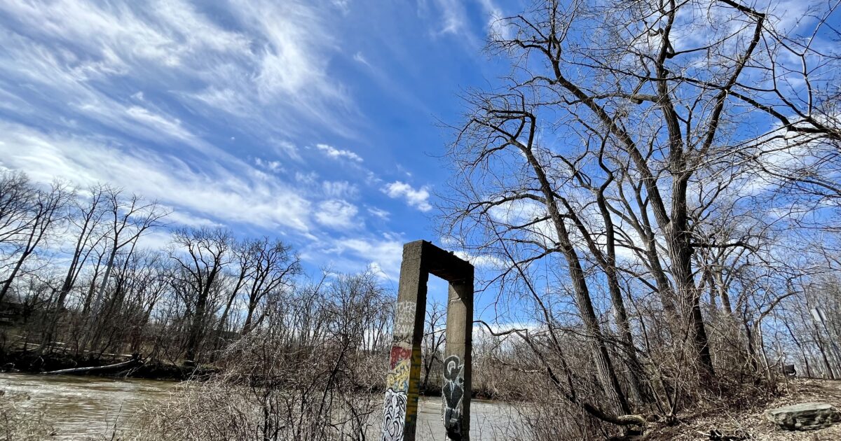 Cette arche de béton sur l’île Perry était l’un des deux supports de la passerelle suspendue qui reliait l’île à Montréal au début du XXe siècle. On peut apercevoir les restes de l’autre support qui s’est écroulé du côté Montréal.