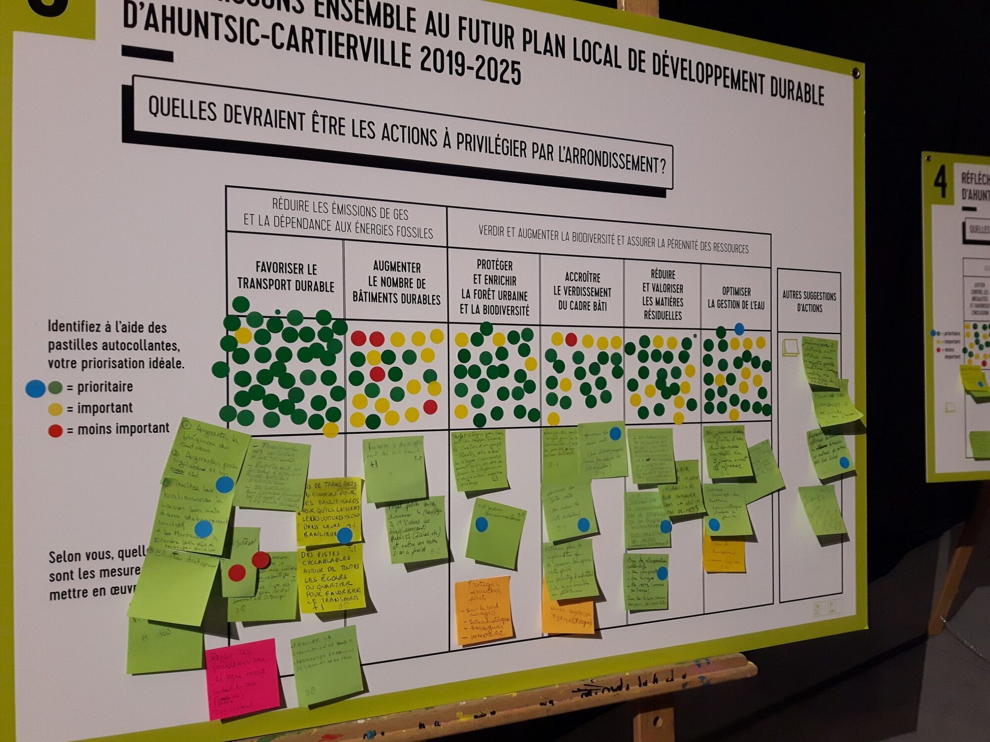 Ils étaient aussi invités à indiquer l’importance qu’ils accordaient à certains thèmes et répondre aux questions à l’aide de pastilles vertes, jaunes et rouges. Ceux et celles qui le désiraient pouvaient faire des propositions sur des «post-it» (papillons adhésifs) qui étaient ensuite apposés sur les affiches.