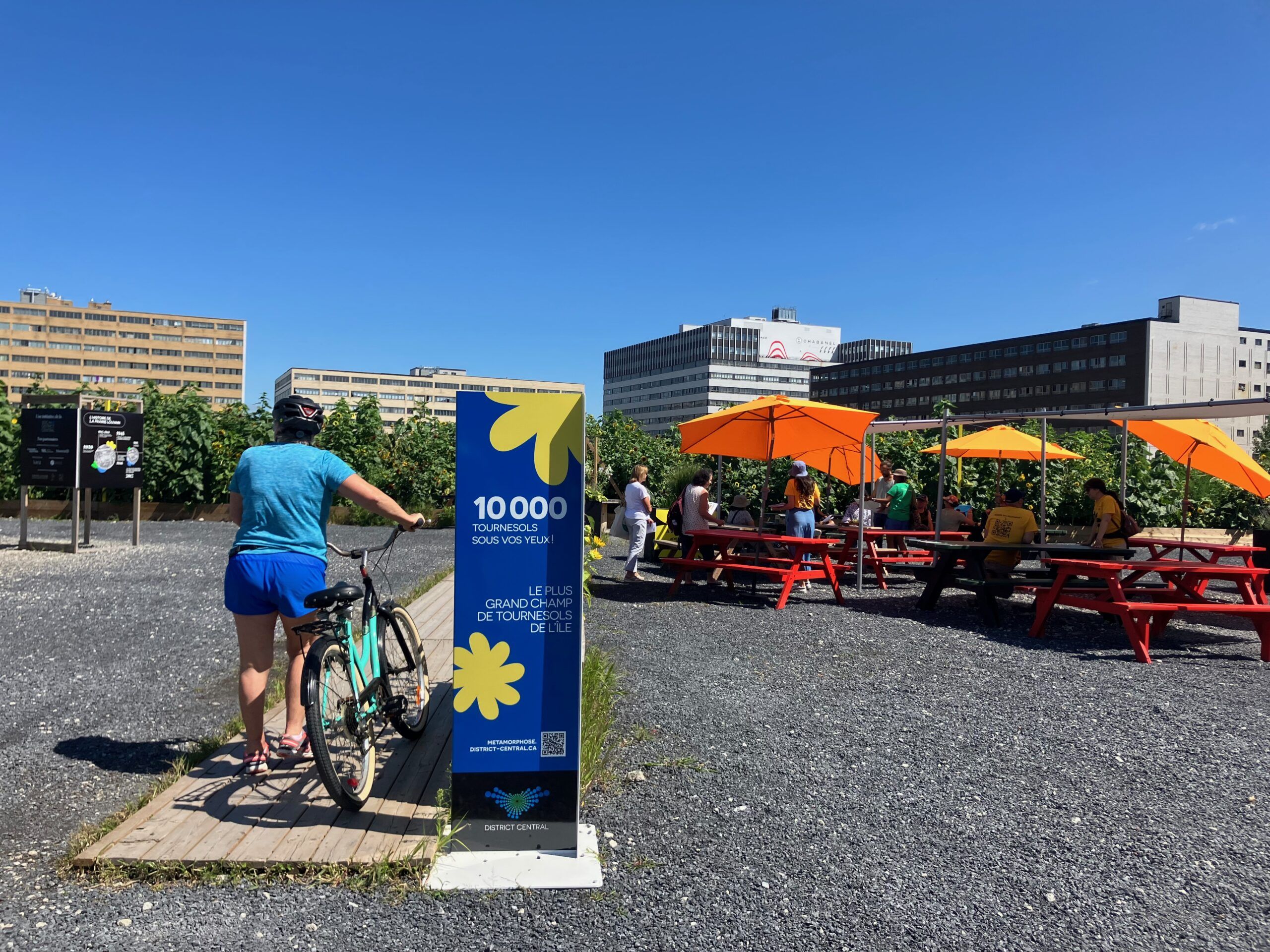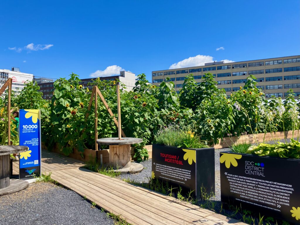 Parions que les oiseaux qui survolent le quartier Chabanel se demandent bien ce qui est apparu en plein cœur du béton, au milieu des édifices du District Central! En fait, il ne faudrait pas leur dire qu’il s’agit de 10 000 tournesols et d’un potager, au risque qu’ils s’en fassent un buffet libre-service!