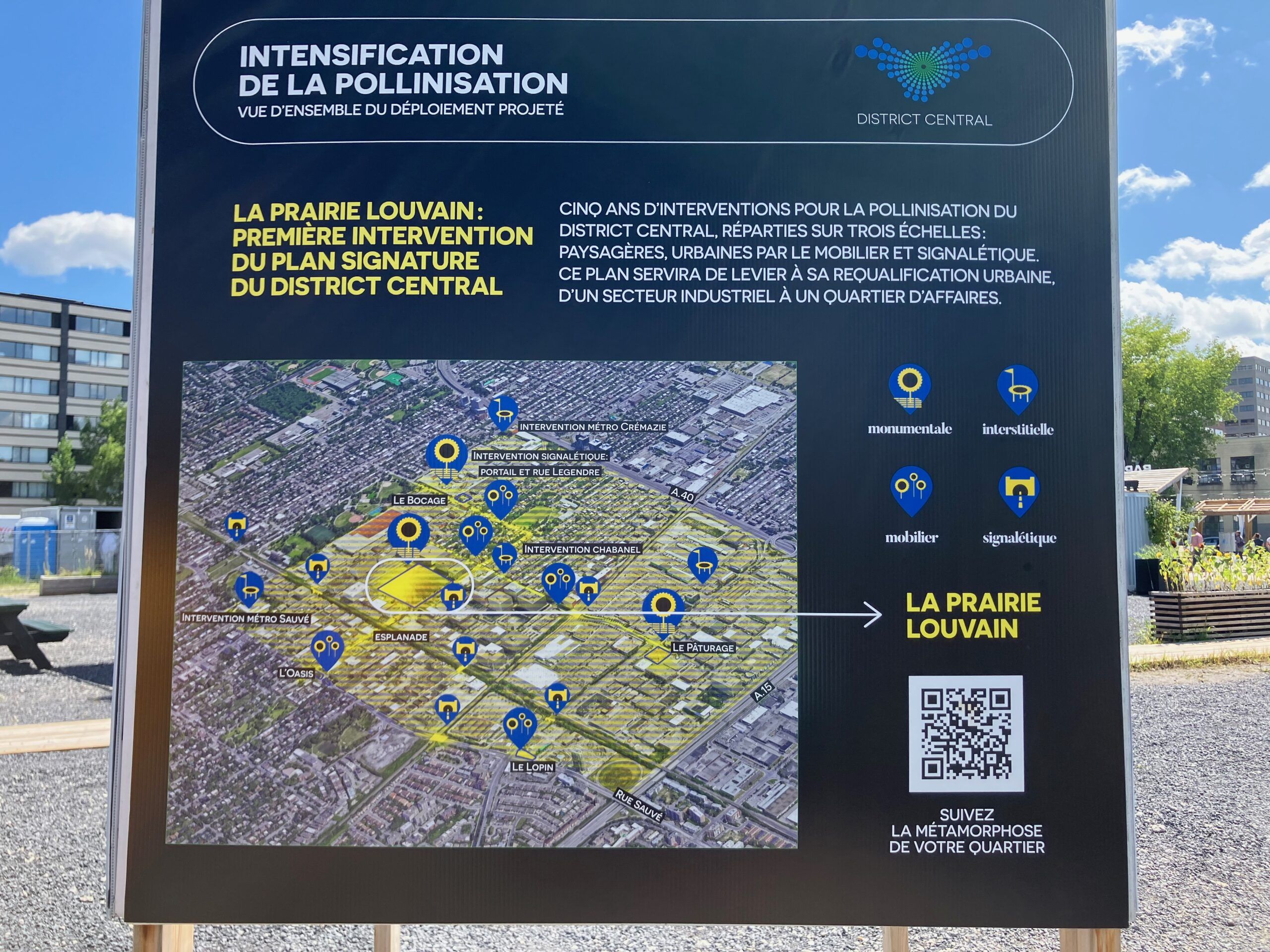Entrée de l’Esplanade Louvain où se trouvent le potager des Cultures solidaires et la Prairie Louvain, composée de 10 000 tournesols, été 2023. (Photo: Anne Marie Parent, JDV)