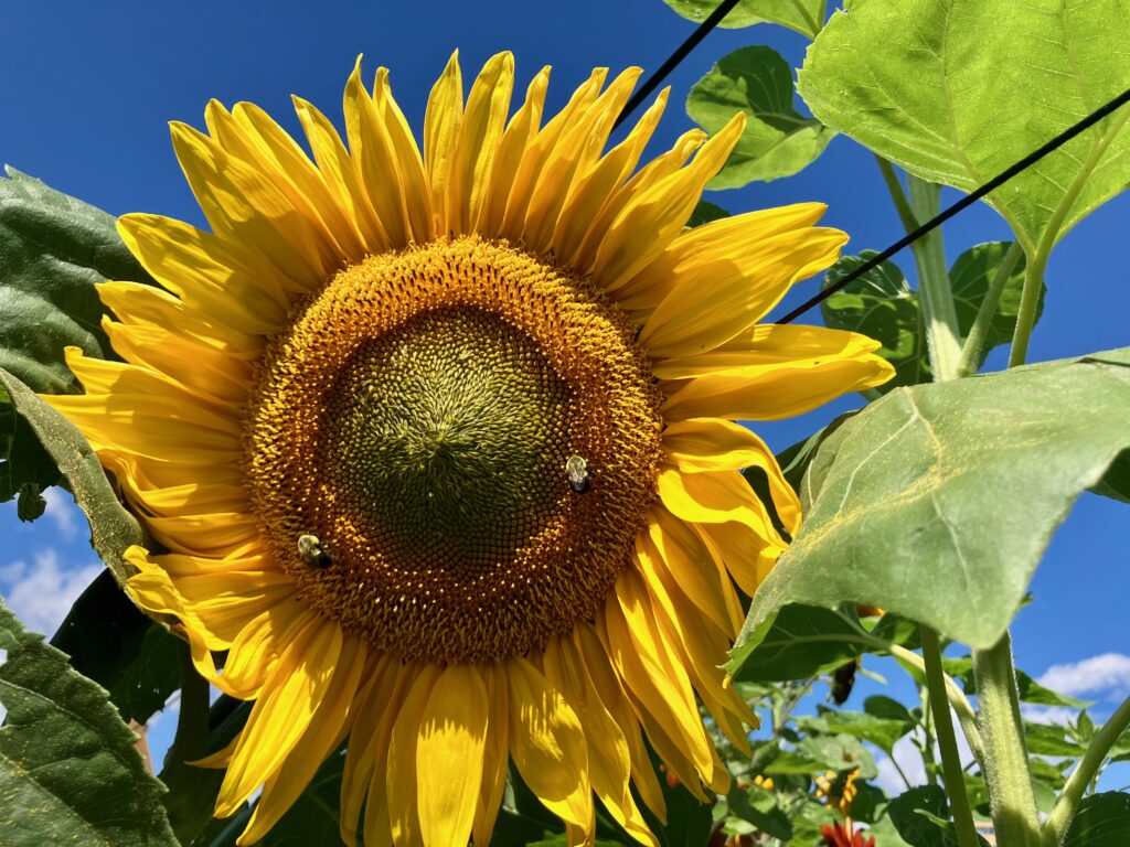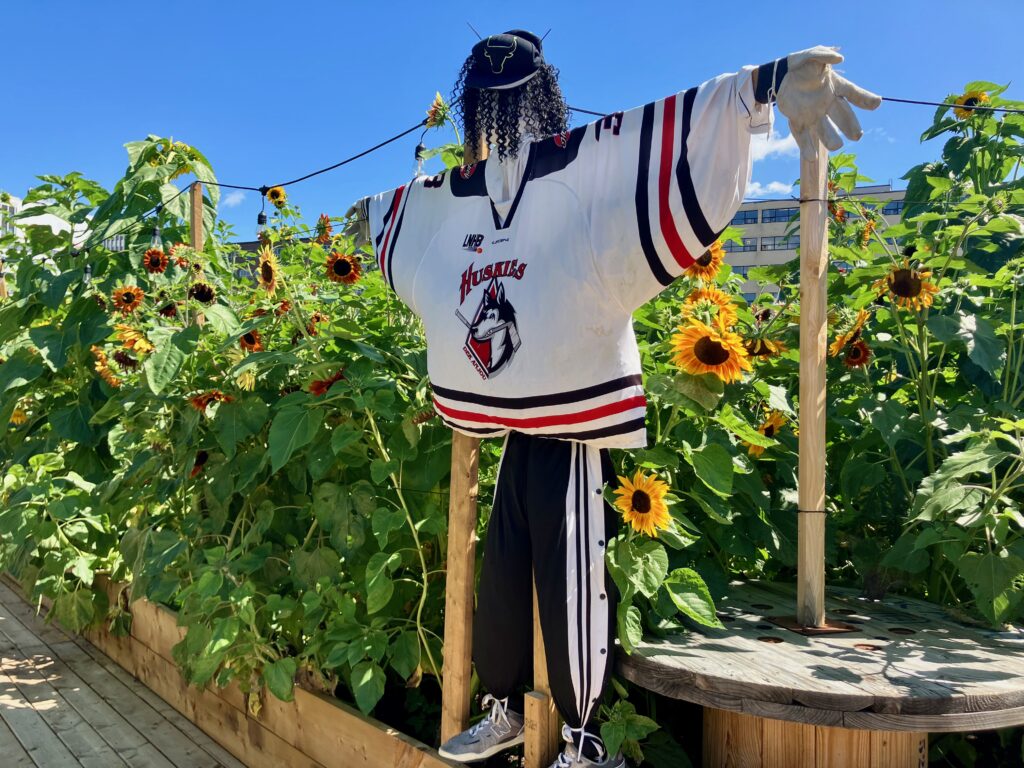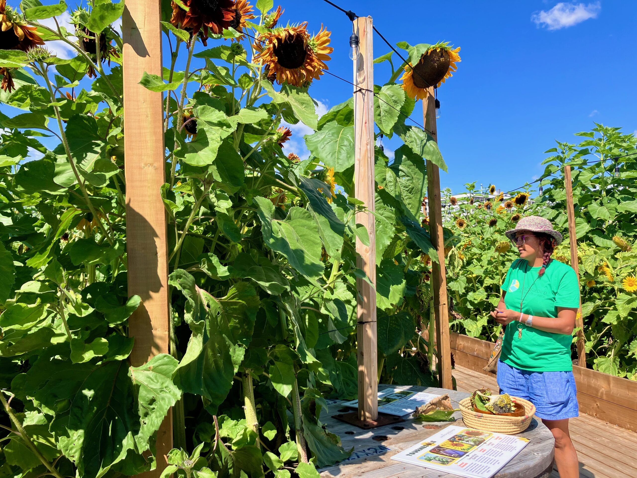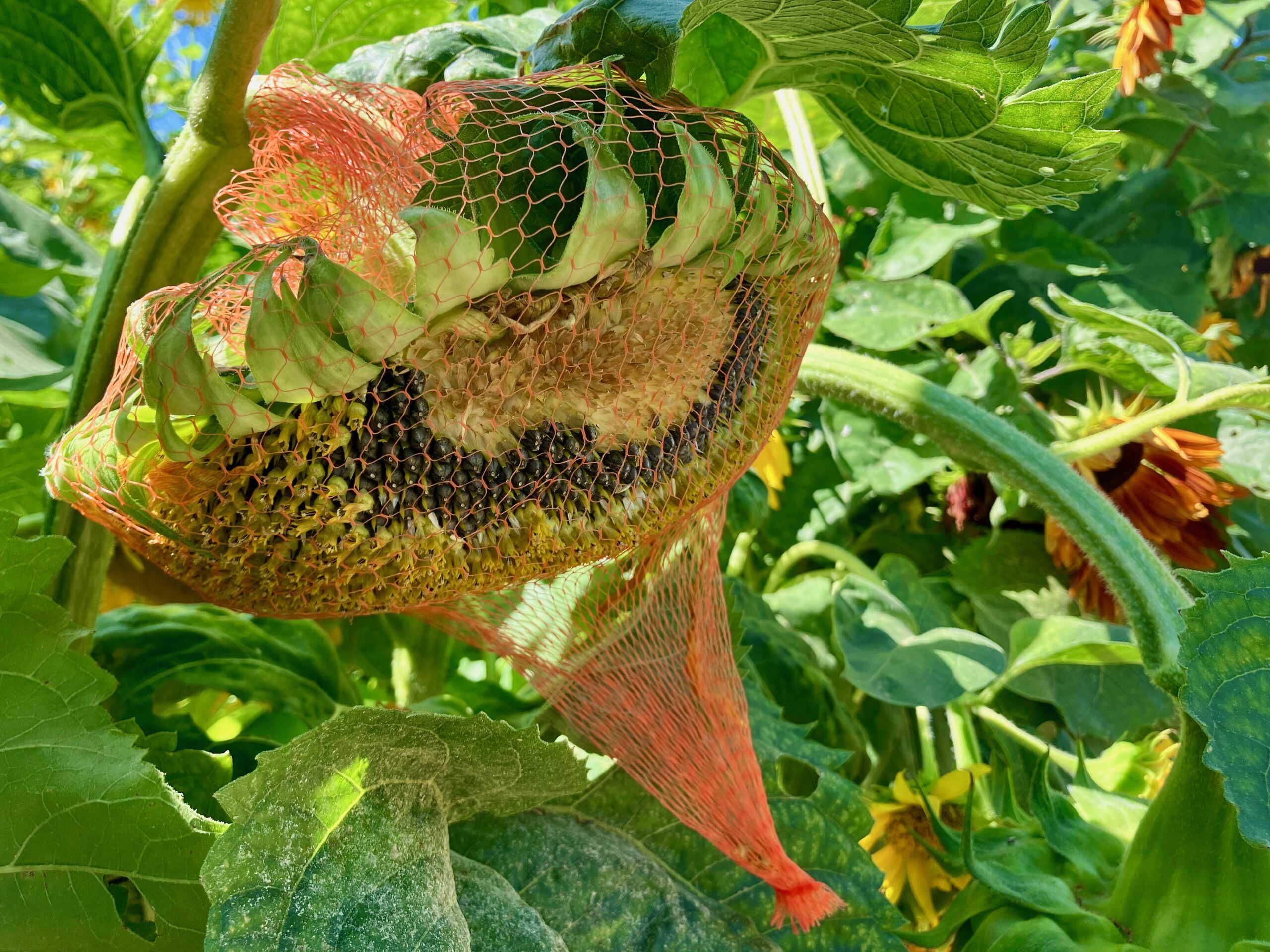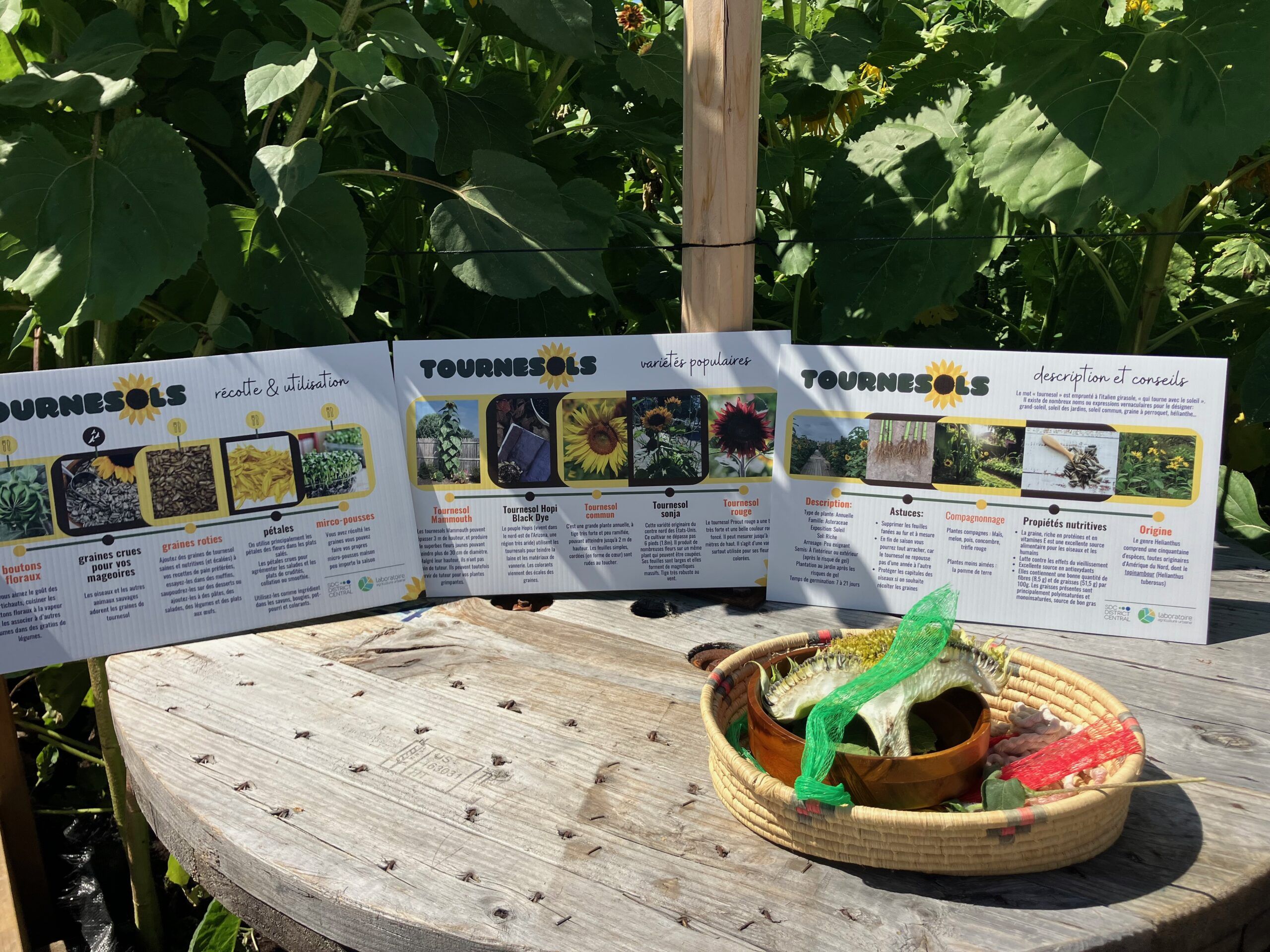 Elle nous raconte les bienfaits de la plante, dont la racine a des propriétés médicinales. En fin de saison, les graines de tournesol – riches en protéines et en vitamine E – seront prêtes à récolter, si les oiseaux ne s’en sont pas fait un festin avant! De là les deux épouvantails dans les allées du champ de la Prairie Louvain et les filets qu’on peut mettre sur les capitules (têtes constituées de nombreuses minifleurs) pour en protéger les graines.
