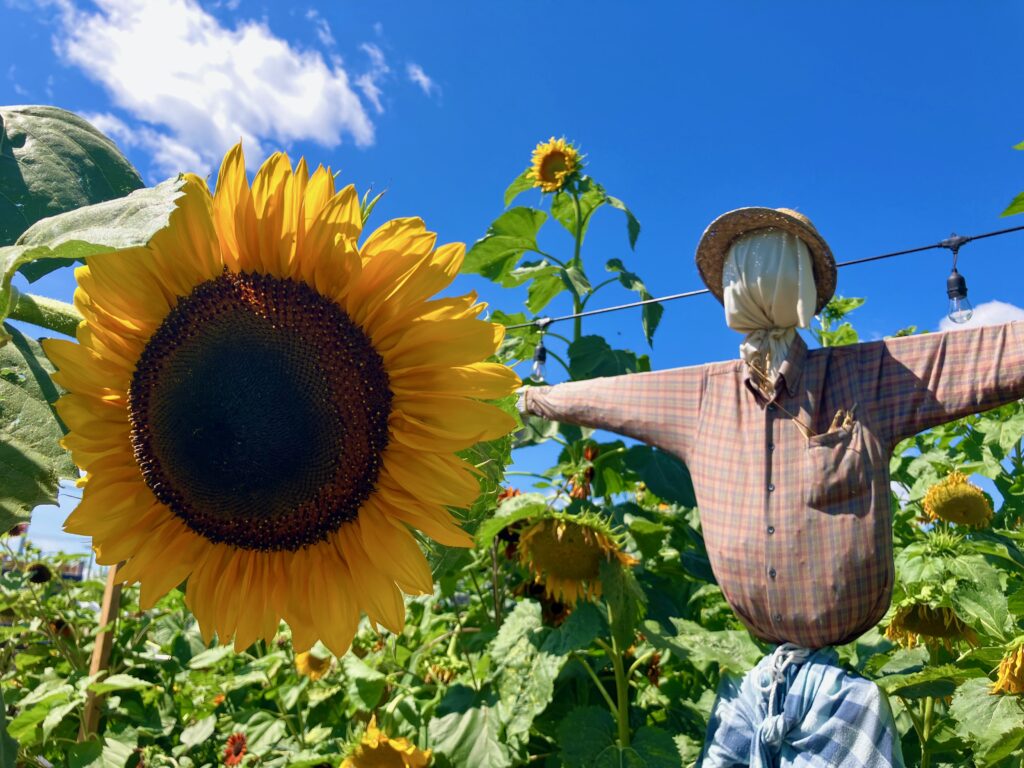Un des deux épouvantails servant à éloigner les oiseaux. La Prairie Louvain, visite guidée du champ de tournesols le 22 août 2023. (Photo: Anne Marie Parent, JDV)