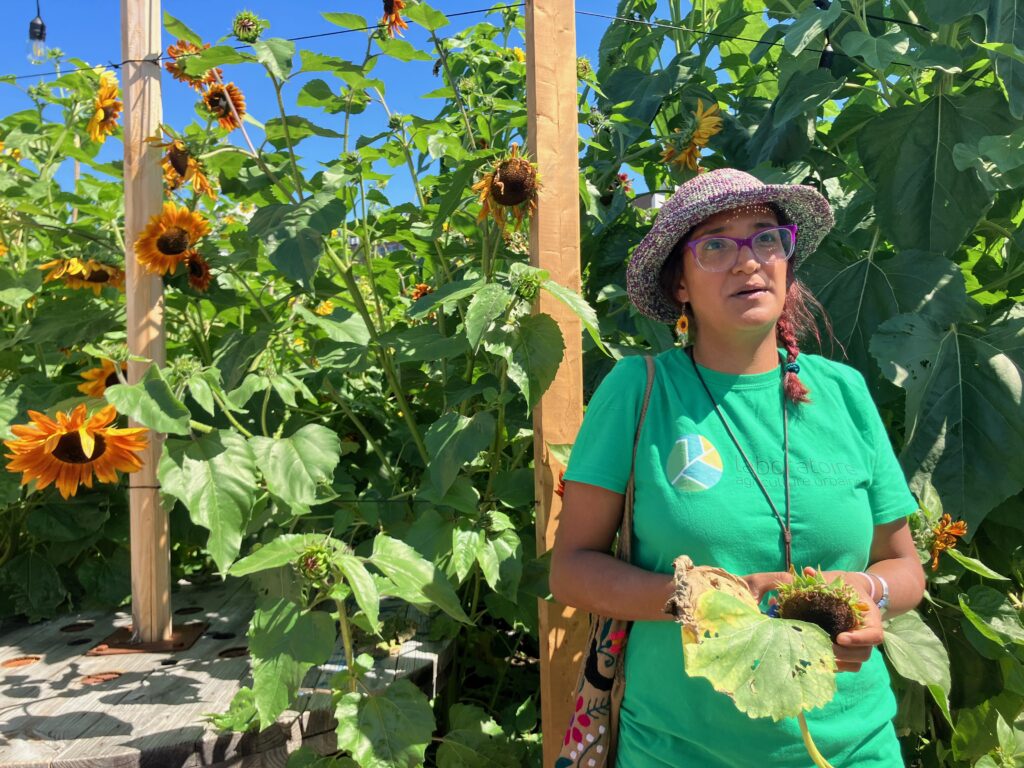 Lilia Luna, animatrice horticole du Laboratoire agricole urbain. La Prairie Louvain, visite guidée du champ de tournesols le 22 août 2023. (Photo: Anne Marie Parent, JDV)