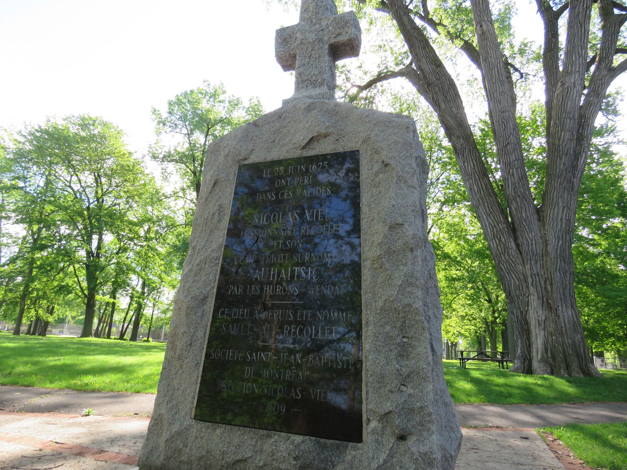 Au parc Nicolas-Viel, une stèle de granite de la Société Saint-Jean-Baptiste de Montréal commémore la première messe célébrée au Canada, le 24 juin 1615, par le Père Denis Jamet et le Père Joseph Le Caron, en présence de Samuel de Champlain.