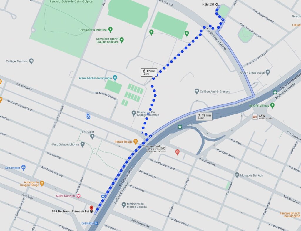 En fait, ce chemin d’accès sans nom (chemin privé?) semble un no man’s land (ou plutôt no pedestrian land) où un certain nombre de résidents de St-Sulpice passent pour rejoindre le métro Crémazie. Il m’est commode de passer par là pour plusieurs raisons, soit dans un premier temps parce que le service des autobus 54 ou 192 sont déficients, aussi parce que ça raccourcit le trajet d’environ 200 mètres sur un trajet qui en ferait 1,4 km en faisant le détour par Crémazie.