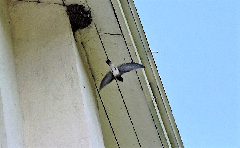 En voici une qui possède une façon intéressante et originale de construire un nid! Lorsqu’elle se met à la tâche, l’hirondelle à front blanc doit tout d’abord trouver un site approprié. À l’origine, c’était sur la paroi d’une falaise (d’où son nom anglais de Cliff Swallow), mais elle s’est vite adaptée aux structures érigées par les hommes comme les ponts ou les corniches des bâtiments, tant qu’elle y dispose d’un bon dégagement pour prendre son envol.