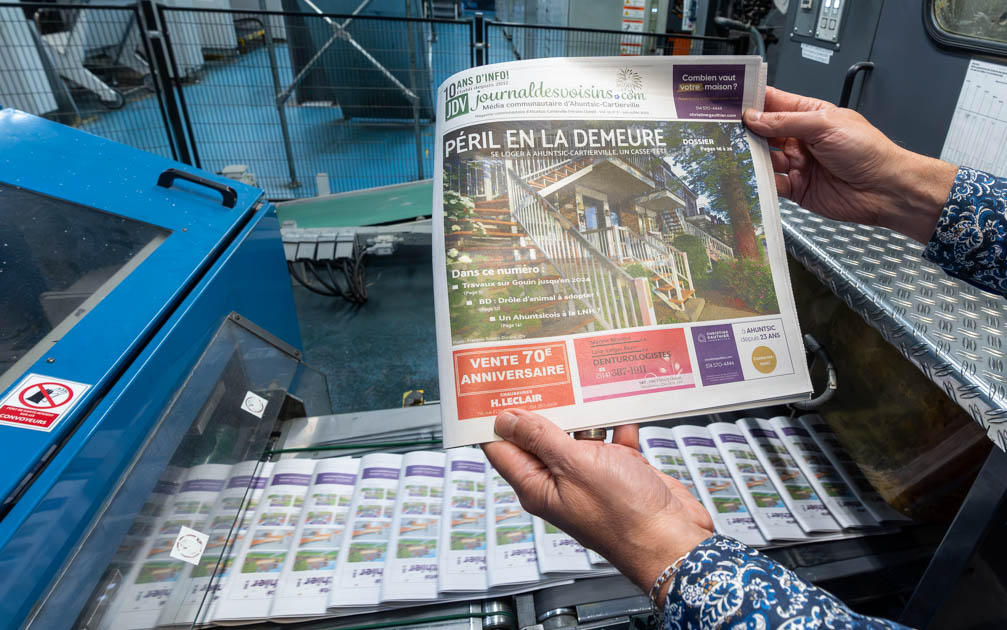 Un exemplaire du Mag papier du Journal des voisins fraîchement imprimé en juin 2023. Alors que Facebook et Google et autres GAFAM menacent de couper l’accès aux contenus de nouvelles en ligne au Canada en guise de représailles contre le projet de loi fédéral C-18 qui vise à forcer les plateformes à contribuer au financement de l’information, force est d’admettre que les journaux imprimés demeurent plus pertinents que jamais pour favoriser la libre circulation d’une information de qualité. (Photo: François Robert-Durand, JDV)