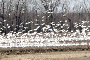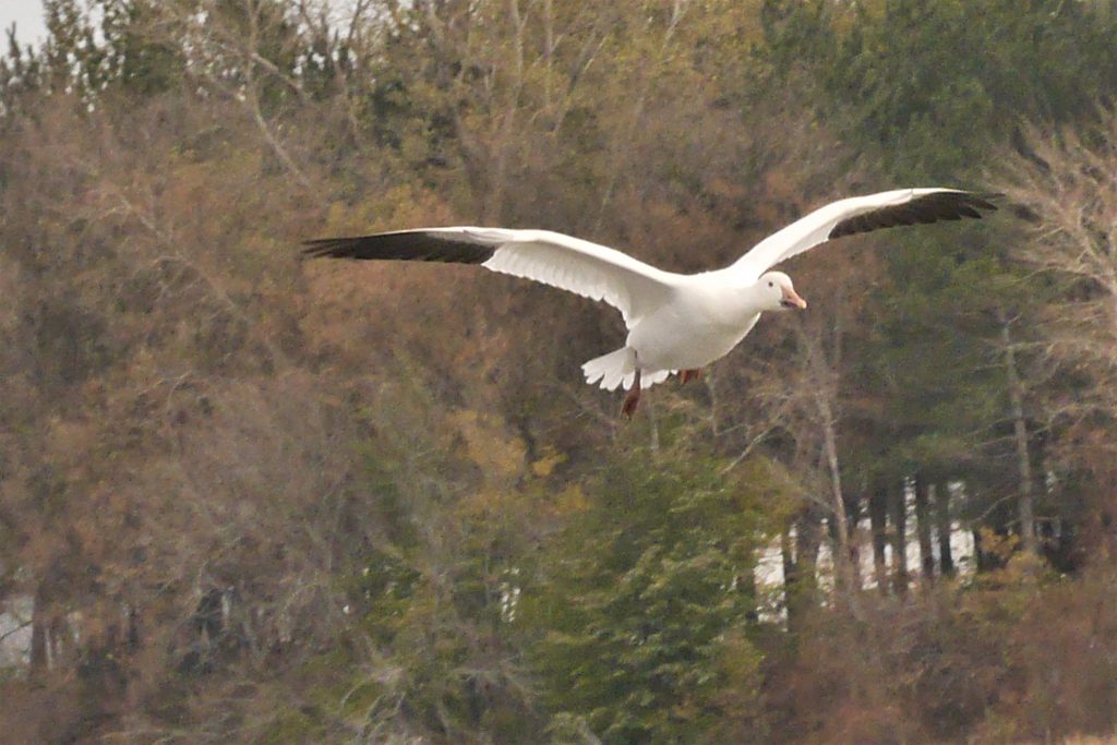Les grands vols d’oies sillonnant le ciel marquent ostensiblement le passage des saisons. Un des rares jours de novembre dernier où le soleil a fait acte de présence, ma conjointe sortant d’un magasin rue Fleury, entend le caractéristique «couac-couac» signalant le passage d’un groupe de ces grands oiseaux. Levant le regard, elle constate qu’il ne s’agit pas de Bernaches comme on s’y attendrait, mais bien d’Oies blanches; le bout des ailes noir sur un corps blanc ne laisse place à aucun doute!