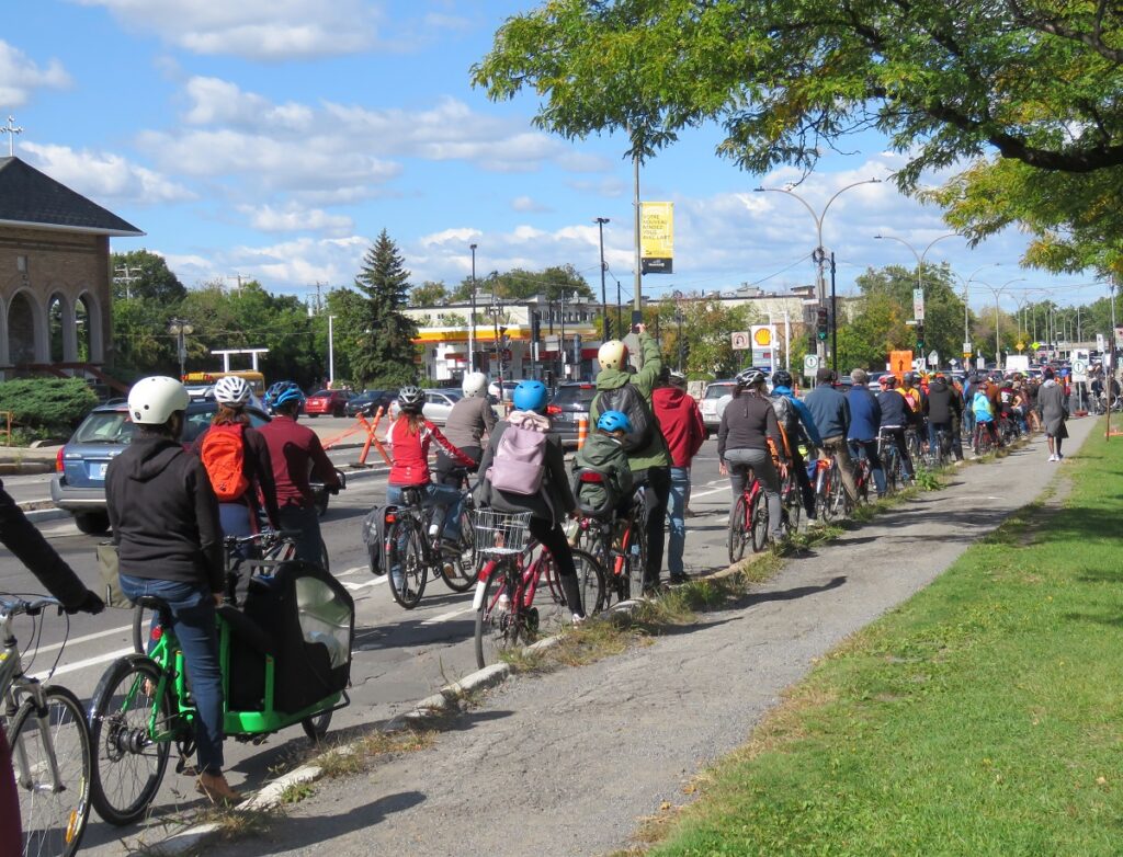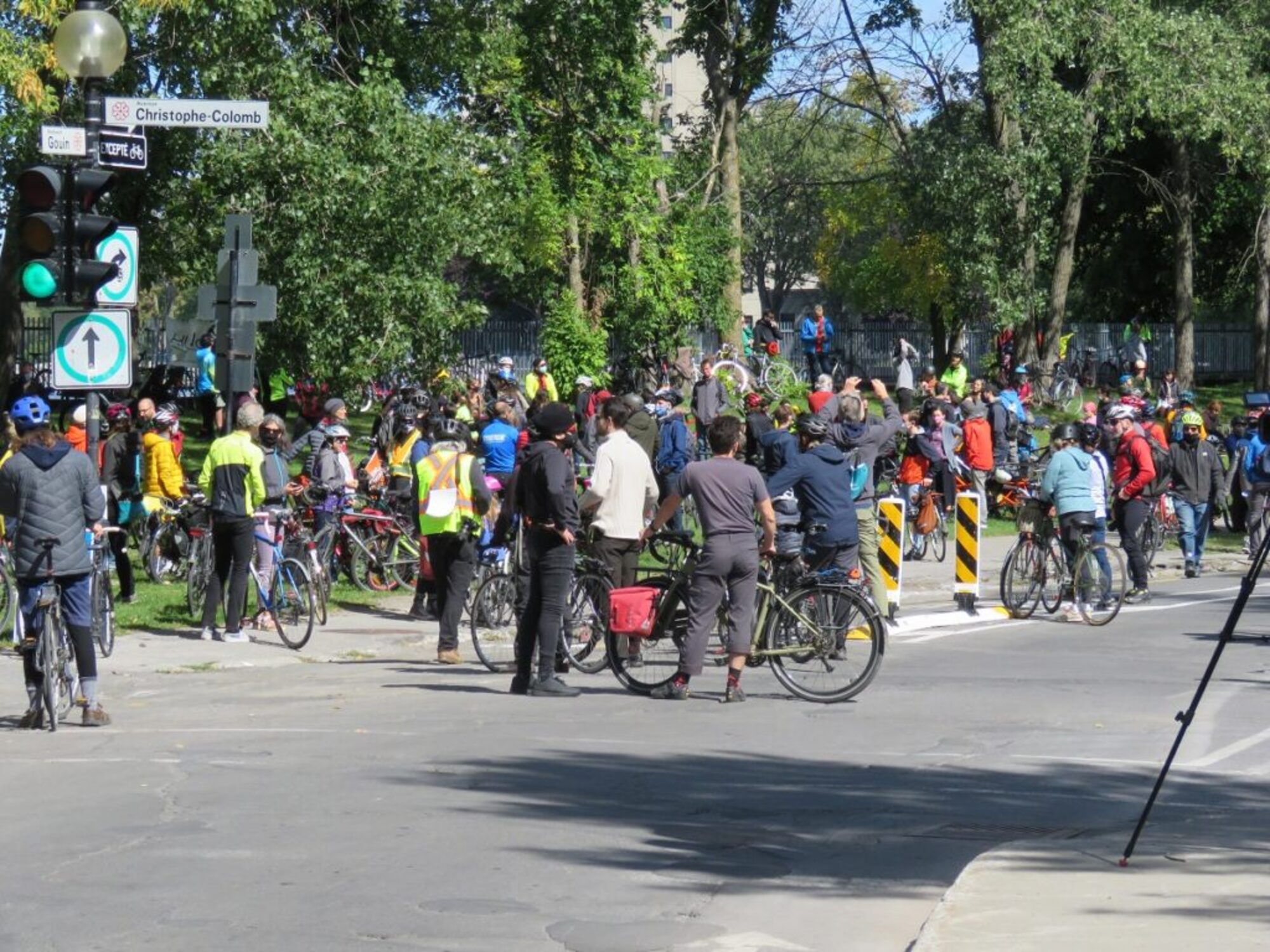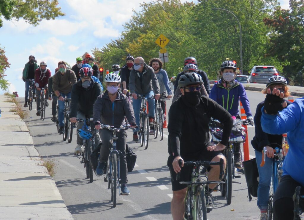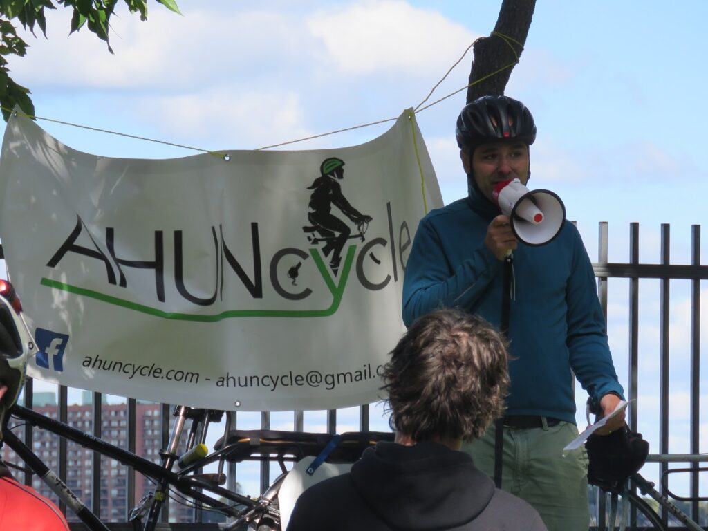 Le défilé de cyclistes avait commencé à rouler par petits groupes, depuis la rue Bellechasse pour terminer leur parcours au pied de l’avenue Christophe-Colomb, là où les participants ont écouté les discours des représentants de plusieurs associations montréalaises de cyclistes, dont Ahuncycle.