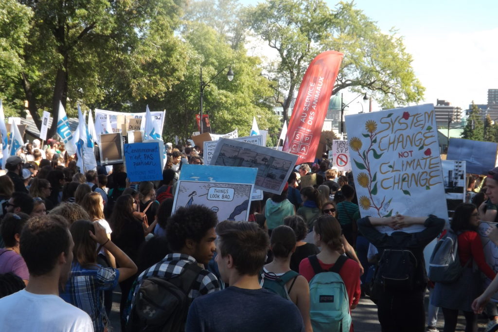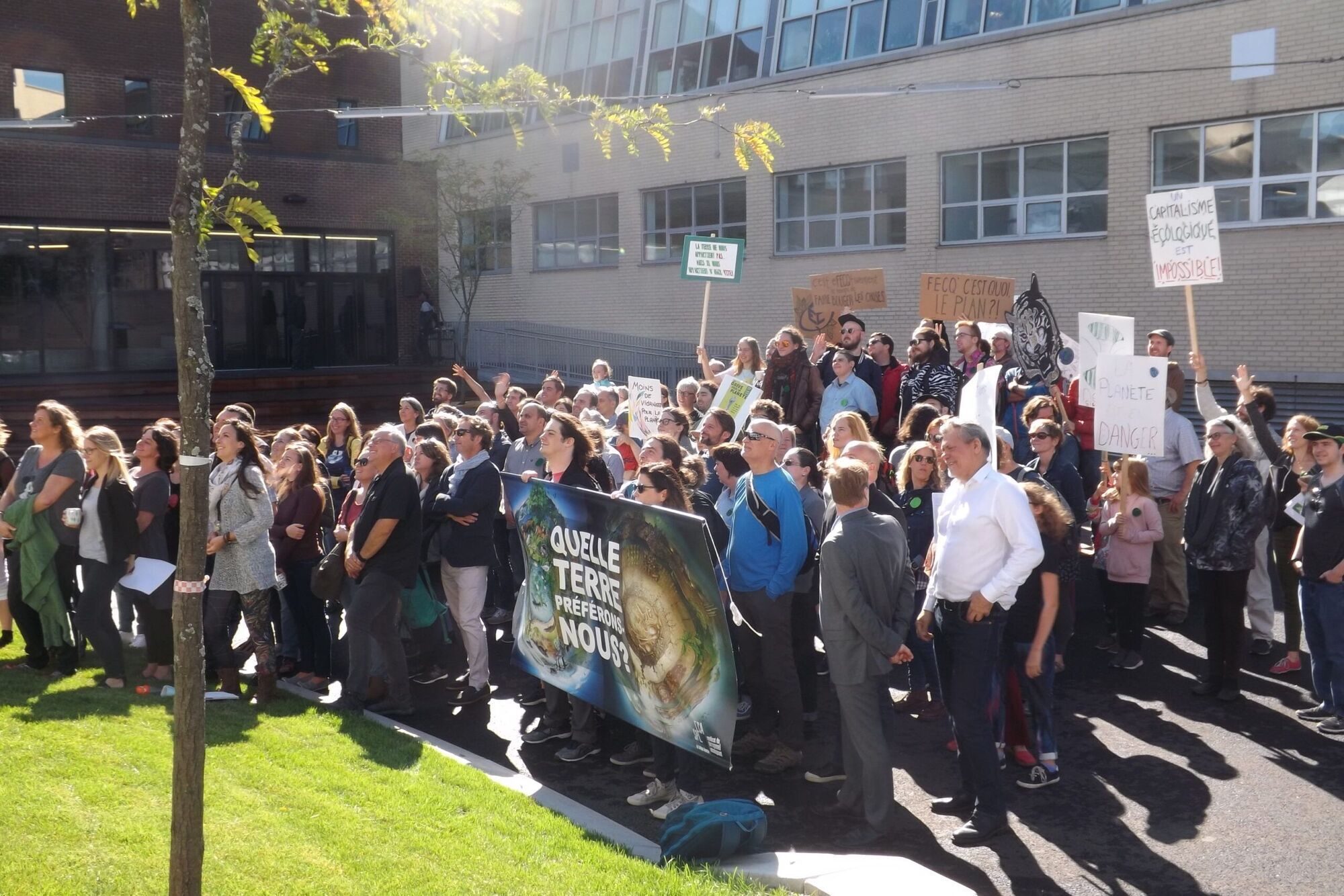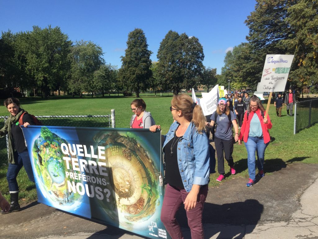 Encore une fois, au chapitre des slogans qu’affichaient les pancartes, l’imagination des participants était édifiante… «On n’a qu’une planète, faut pas qu’on s’TRUMP!» ; «J’ai mal à la Terre» (chanson de Vigneault) ; «Il n’y a pas de planète B ! » ; «Les dinosaures pensaient qu’il leur restait du temps, eux aussi!» ; «La Terre ne nous appartient pas, nous appartenons à la Terre!» : «Notre maison brûle et vous regardez ailleurs…»