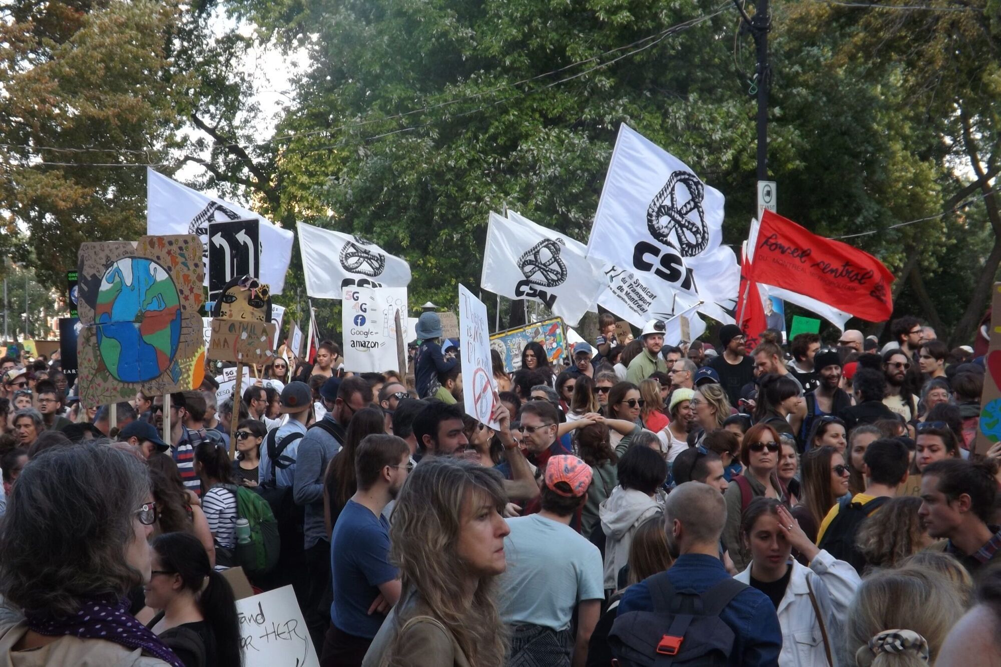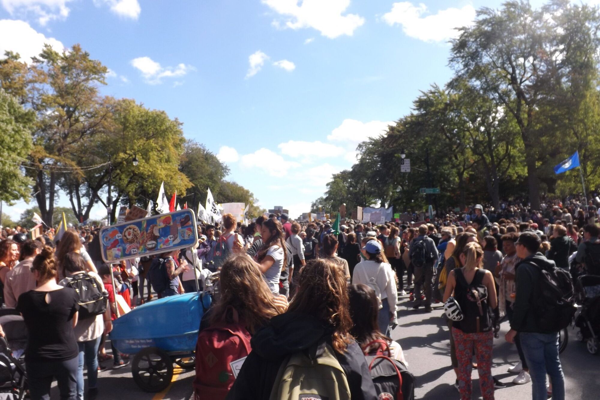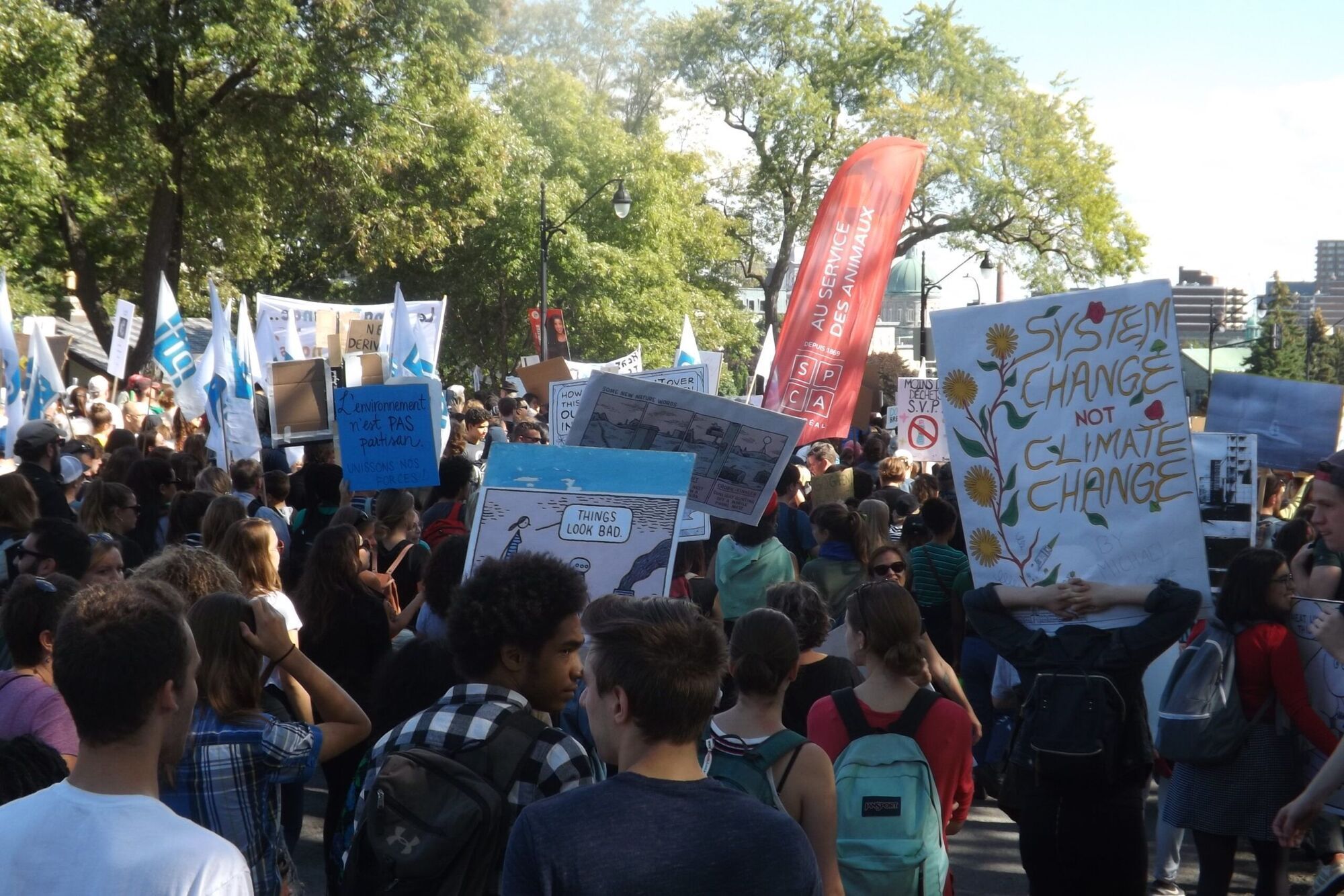 La marche se terminait au parc Bonaventure, le plus vaste espace public au centre-ville de Montréal. Alors que certaines personnes avaient déjà gagné le point d’arrivée, d’autres étaient encore au point de départ. Le cortège s’étendait donc sur plus de quatre kilomètres.