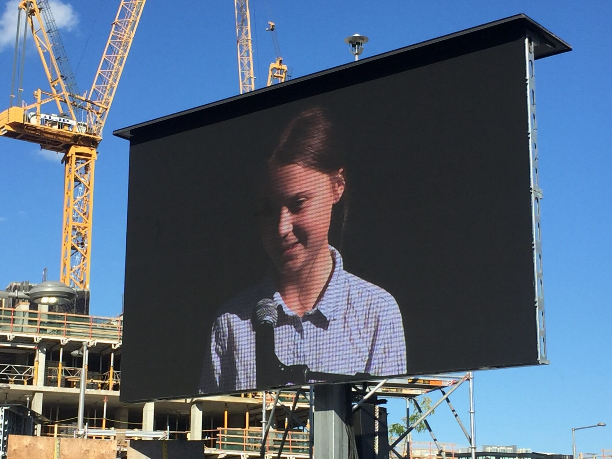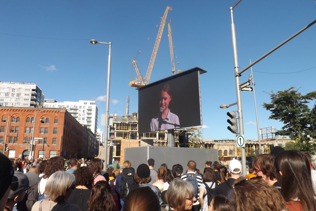 Vers 16h, la militante suédoise de 16 ans, Greta Thunberg, a pris la parole sur la scène installée au parc Bonaventure après avoir marché en tête du cortège. Son visage est apparu sur plusieurs écrans et sa voix à résonné dans de nombreuses caisses de son disposées dans le centre-ville.
