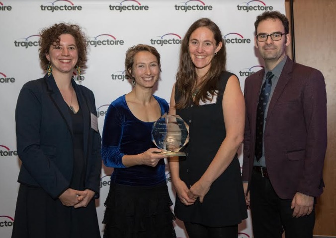 Remise du Prix Guy-Chartrand au MEAC. De g. à dr.: Chloé Dodinot, membre du jury de sélection et directrice générale du Réseau québécois de Villes et Villages en santé ; Raphaëlle Dancette et Mélanie Busby, co-porte-paroles de la Coalition pour un boulevard Papineau et membre de Mobilisation environnement Ahuntsic-Cartierville ; et Étienne Grandmont, vice-président de Trajectoire Québec et directeur général et porte-parole d’Accès transports viables. (Photo: Muriel Leclerc)