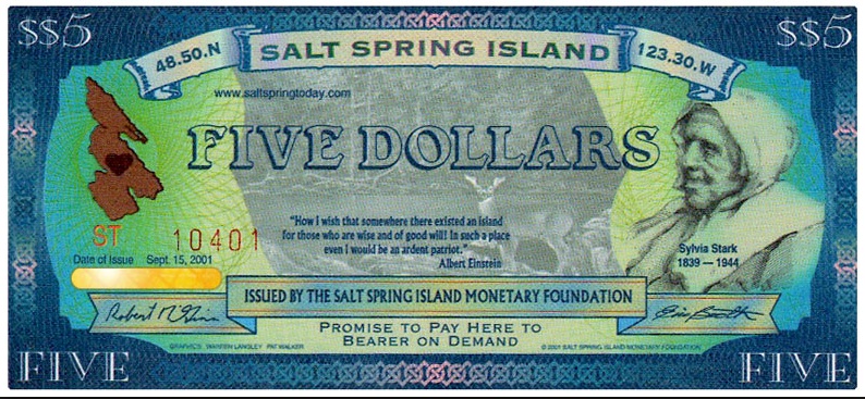 Au Canada, le Salt Spring Dollar a été lancé en 2001 sur l’île de Salt Spring, en Colombie-Britannique. Les coupures de billets de 1 et de 100 dollars arborent des personnalités historiques, dont plusieurs comportent des visages de personnages féminins s’étant illustrés.