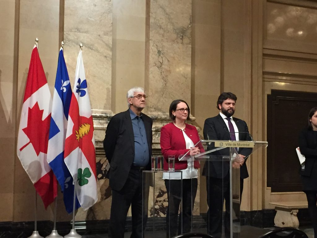 André Gravel, président de Solidarité Ahuntsic; Émilie Thuillier, mairesse d’Ahuntsic-Cartierville; et Eric Alan Caldwell, responsable de l’urbanisme, du transport et de l’Office de consultation publique de Montréal . (Photo: Jules Couturier, JDV)