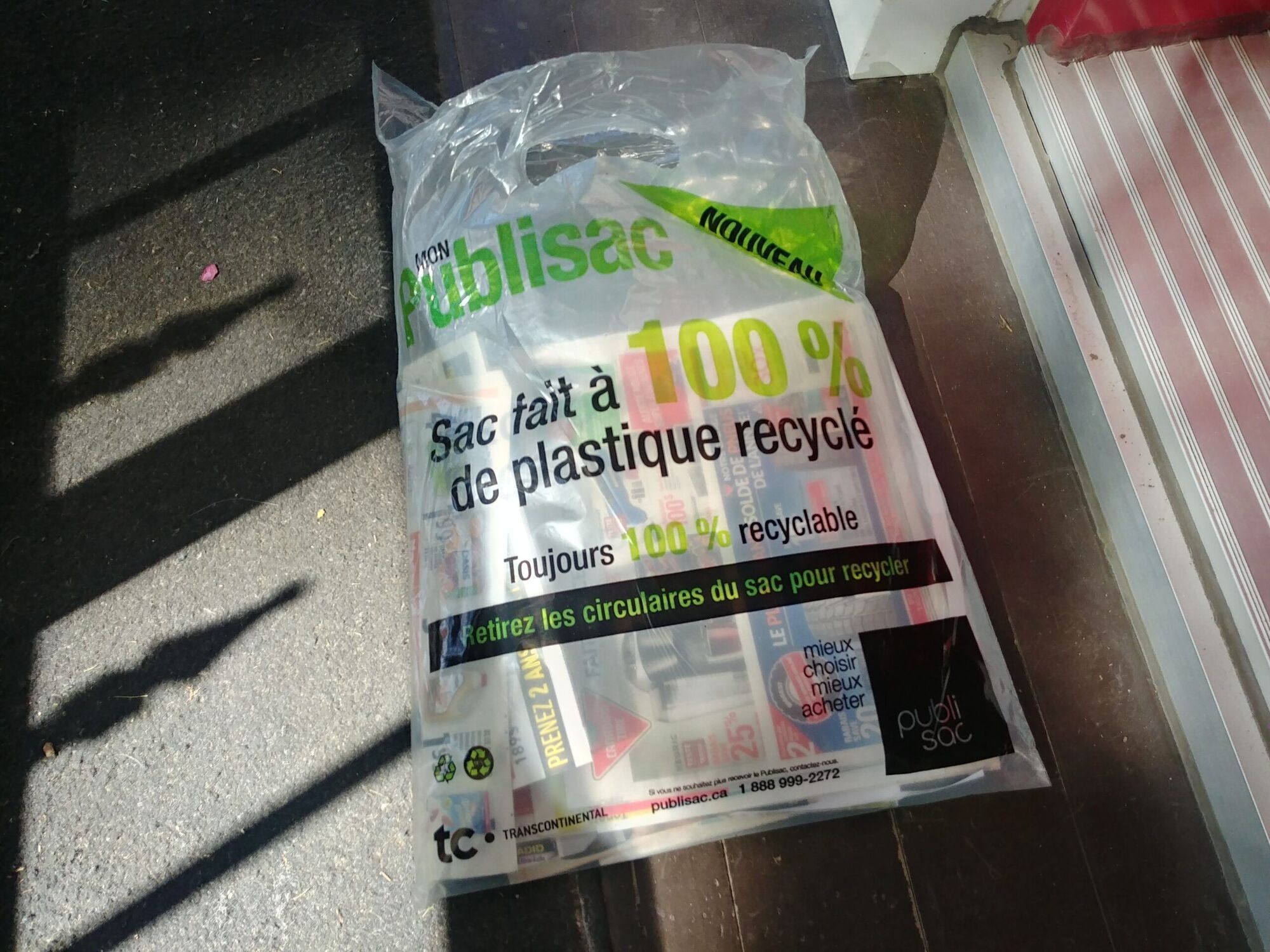 En septembre, la compagnie TC Transcontinental annonçait l’arrivée d’un nouveau sac composé à 100% de plastique recyclé, afin de réduire son empreinte environnementale. Cependant, la circulaire doit tout de même être retirée de son emballage afin d’être recyclée.