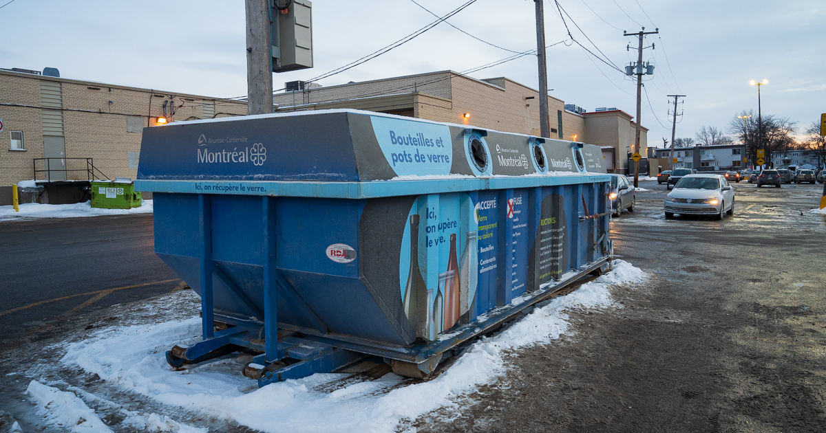 Le conteneur de verre situé dans le stationnement de l’épicerie Métro à la place Fleury. Photo : JDV / François Robert-Durand