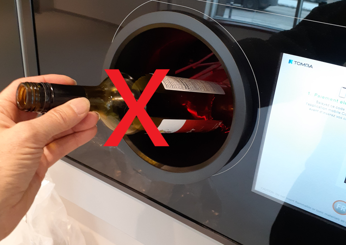 La «gobeuse nouvelle génération» a bien accepté et pulvérisé le retour de notre bouteille (consignée) de panaché de vin [«cooler»]. Elle a cependant refusé celle (non consignée) de la bouteille de vin.