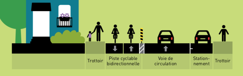Le projet prévoit l’implantation d’une piste cyclable bidirectionnelle (comme celle située sur la rue Christophe-Colomb avant le plan estival dû à la COVID-19) sur un des deux côtés de la rue, où le stationnement est éliminé.