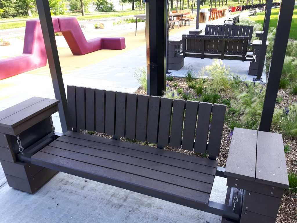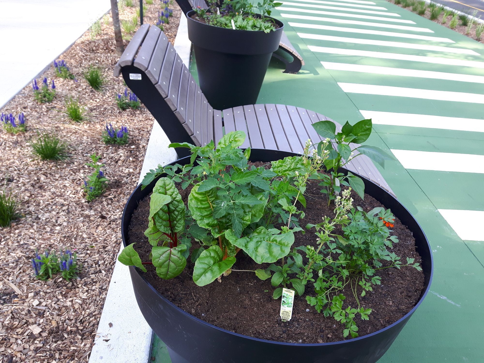 Différents jeux, aménagements modernes et colorés, revêtements de sol originaux, chaises pour la détente, balançoires, fines herbes, fleurs comestibles, plantes vertes, contenants à recyclage, et le reste, se côtoient joyeusement.