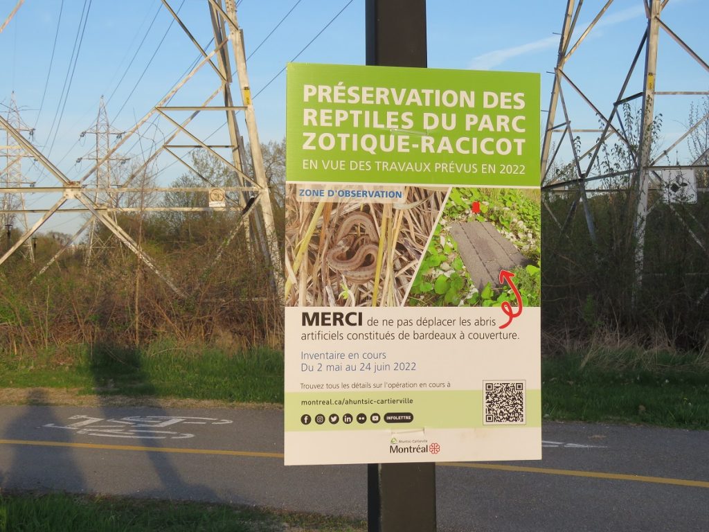 Jusqu’au 24 juin, l’arrondissement procède à un inventaire de la faune dans le parc Zotique-Racicot, situé à deux rues de la prison de Bordeaux, entre le boulevard Henri-Bourassa et la rue de Salaberry. L’objectif de l’inventaire : confirmer la présence de couleuvres brunes, une espèce susceptible de devenir vulnérable au Québec, dans ce parc qui doit faire l’objet de travaux de réaménagement cette année.