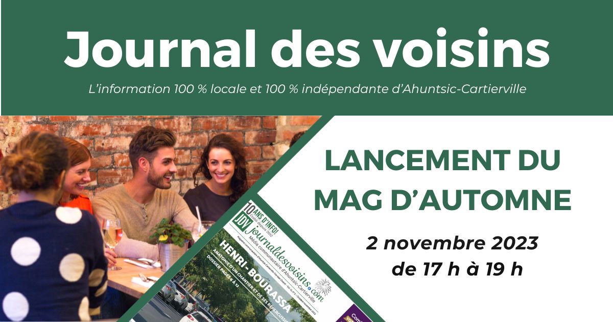 Le Journal des voisins, votre source d’information locale indépendante, convie le public à son événement de lancement du Mag d’automne 2023. Ce 5@7 se tiendra le jeudi 2 novembre de 17 h à 19 h au restaurant Il Cenone, situé au cœur de Cartierville.