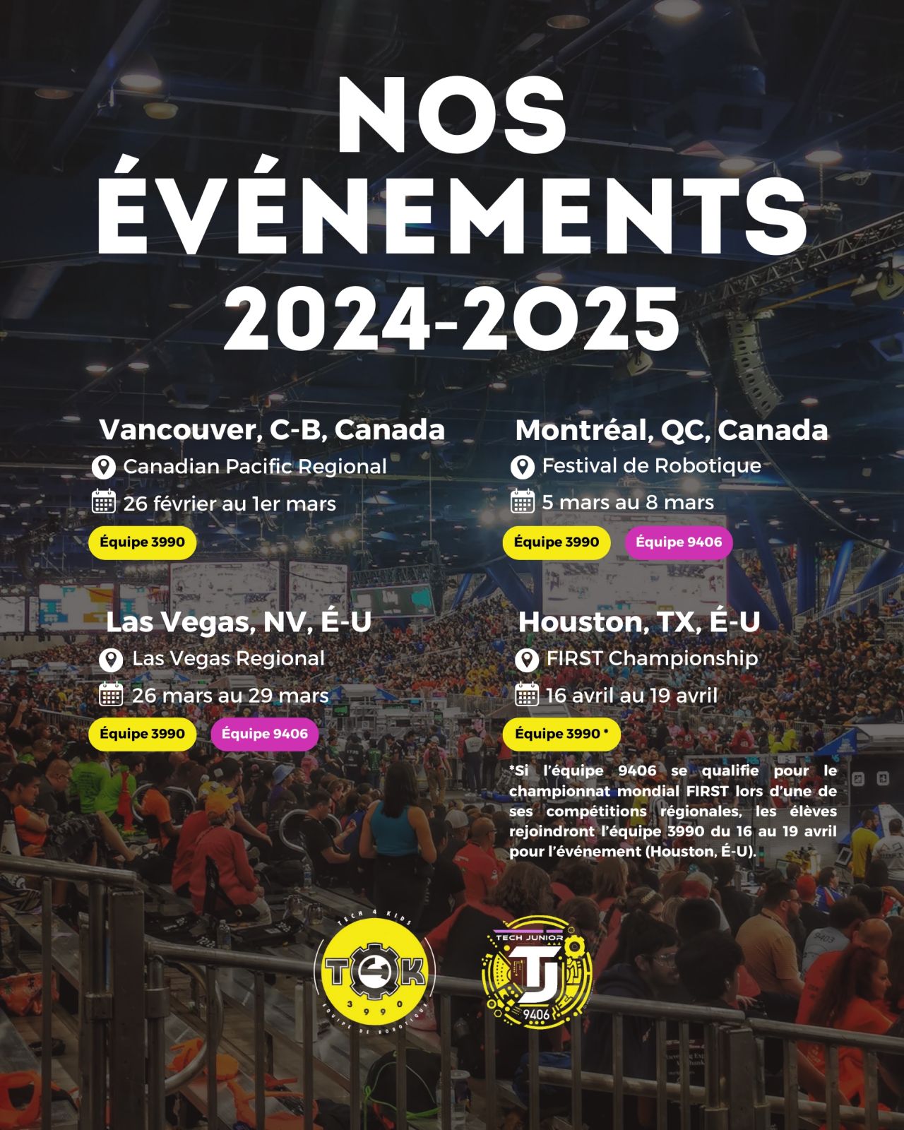 L’organisme FIRST (Favoriser l’Inspiration et la Reconnaissance des Sciences et de la Technologie) organise les compétitions pour répondre à sa mission d’inspirer les jeunes du Québec, en mettant l’accent sur les Sciences, la Technologie, l’Ingénierie et les Mathématiques (STIM).