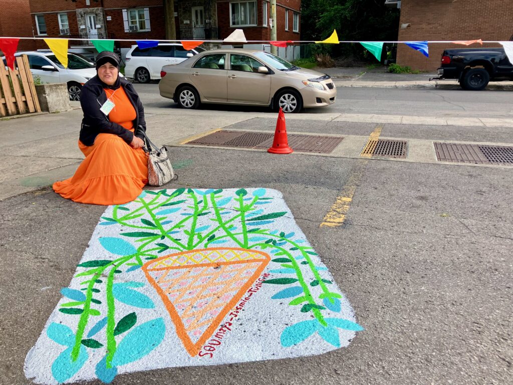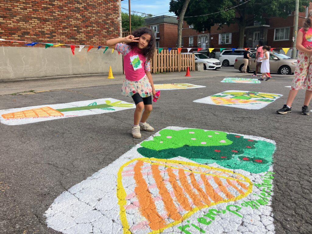 Une fois le choix de la plante établi, les participant-e-s ont fait leur dessin sur une maquette en petit format. La deuxième étape était la reproduction en grand format directement sur l’asphalte du stationnement de la crèmerie Henri-Bourassa.