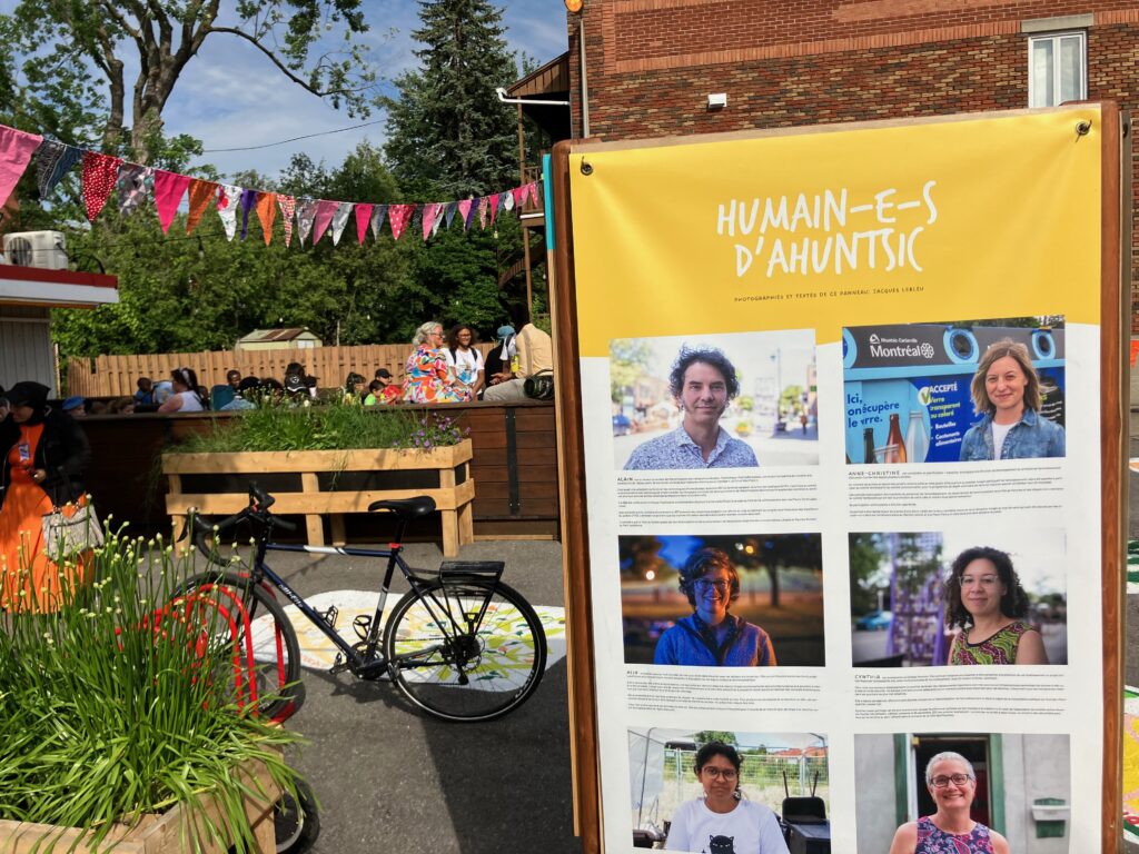 Ville en vert a fourni des bacs à plantes et Solon des supports à vélos, pour encourager le transport actif vers la crèmerie. Des panneaux d’information faits en bois présentent une exposition de photos sur des résident-e-s de l’arrondissement (Humain-e-s d’Ahuntsic, par Solon et Jacques Lebleu).