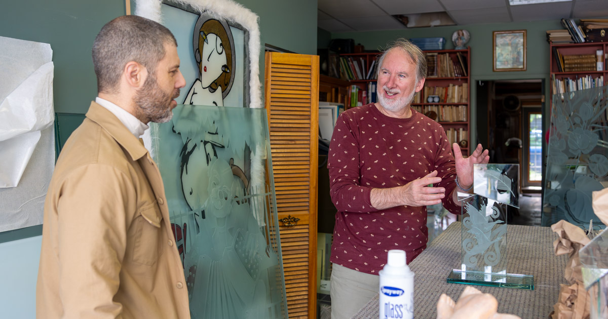 De gauche à droite: le gagnant du Prix de l’Innovation 2023, discute avec Denis Gagnon, le créateur du trophée à l’Atelier St-Marc, sur Gouin Est. (Photo: François Robert-Durand, JDV)