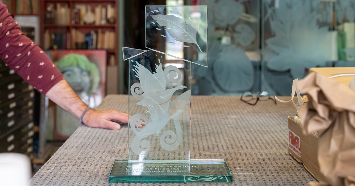 Le trophée du Prix de l’innovation 2023 de l’ACPQ a été confectionné sur mesure pour le projet d’échange mené par Laurent Nicolas et Chad Hollett.