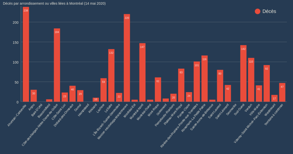 Finalement, pour assurer le déconfinement dans la grande région de Montréal, le PM Legault a dit que différentes conditions devaient être au rendez-vous, notamment une baisse des hospitalisations (au 14 mai, il y a 42 personnes de moins d’hospitalisées). M. Legault a mentionné qu’il faut également qu’il y ait une baisse marquée des décès, ce qui n’est pas le cas. À ce chapitre, Ahuntsic-Cartierville vient en tête de liste.