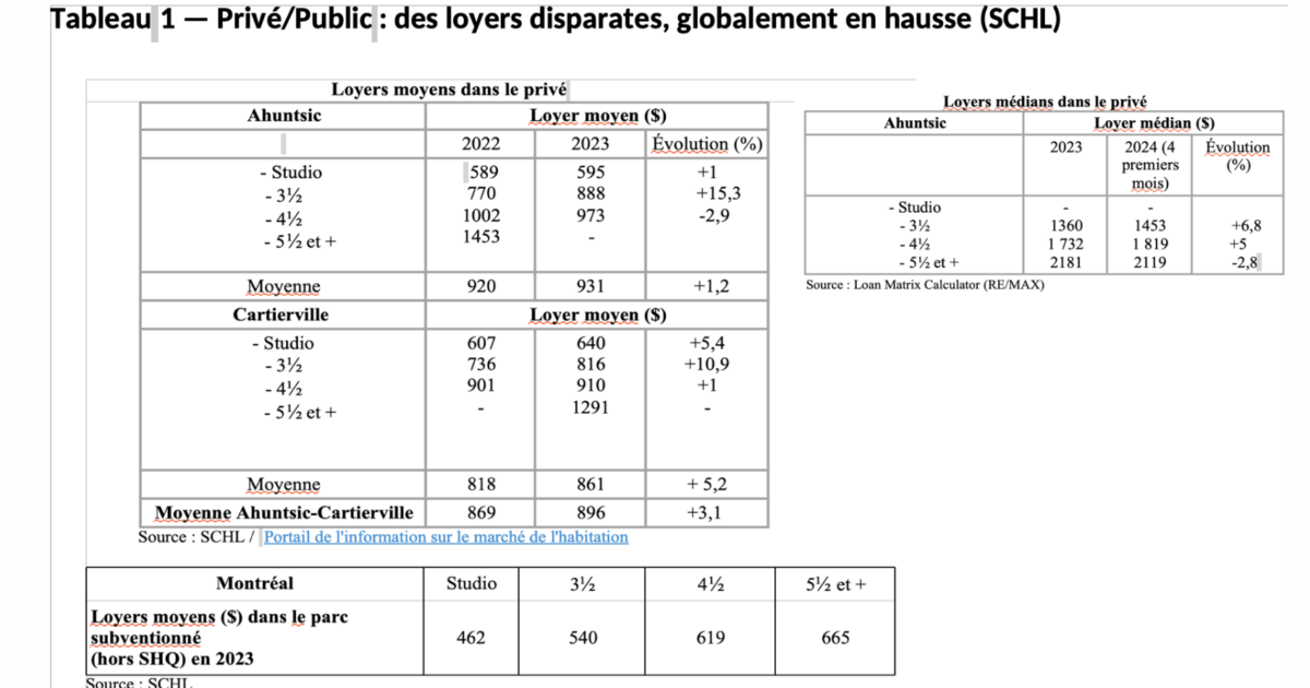 À noter que la «hausse très forte» des loyers concerne surtout les 3 ½, car selon les données de la SCHL, les loyers moyens des 4 ½ auraient quelque peu baissé entre 2022 et 2023 (voir le tableau 1, ci-dessous). Mais la tendance est à la hausse tant à Ahuntsic qu’à Cartierville (+3,1 % en moyenne).
