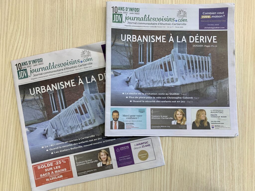 «Les citoyennes et citoyens d’Ahuntsic-Cartierville apprécient le Journal des voisins, a-t-il déclaré. La pertinence d’une presse hyperlocale ne fait aucun doute et ce journal, qui a fêté ses dix ans l’an dernier, connaît un vif succès auprès des lecteurs et des annonceurs. Espérons qu’il sera encore là dans dix ans et, pourquoi pas, dans cent ans!»