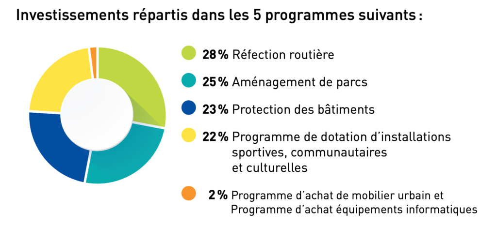 On apprend dans la présentation budgétaire 2020 de l’arrondissement Ahuntsic-Cartierville que les investissements seront répartis dans les cinq programmes suivants : 28 % pour la réfection routière, 25 % pour l’aménagement de parcs, 23 % pour la protection des bâtiments, 22 % pour le programme de dotation d’installations sportives, communautaires et culturelles et 2 % pour le programme d’achat de mobilier urbain et le programme d’achat d’équipements informatiques.