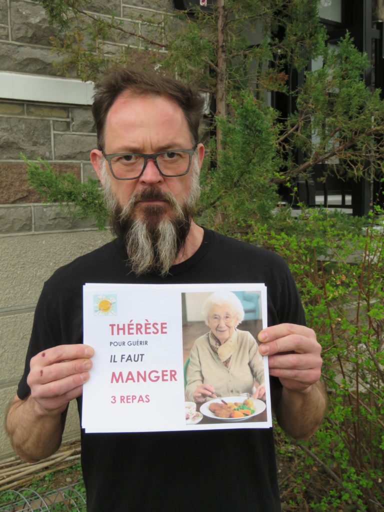 Réal Migneault avec une des affiches qu’il a imprimées et laissées à la vue de sa mère sur les murs de la chambre dans laquelle elle a été installée au CHSLD Berthiaume-du-Tremblay, quand elle a été déclarée atteinte de la Covid-19. M. Migneault souhaitait encourager sa mère à guérir, en mangeant et en s’hydratant. (Photo : jdv – Philippe Rachiele)