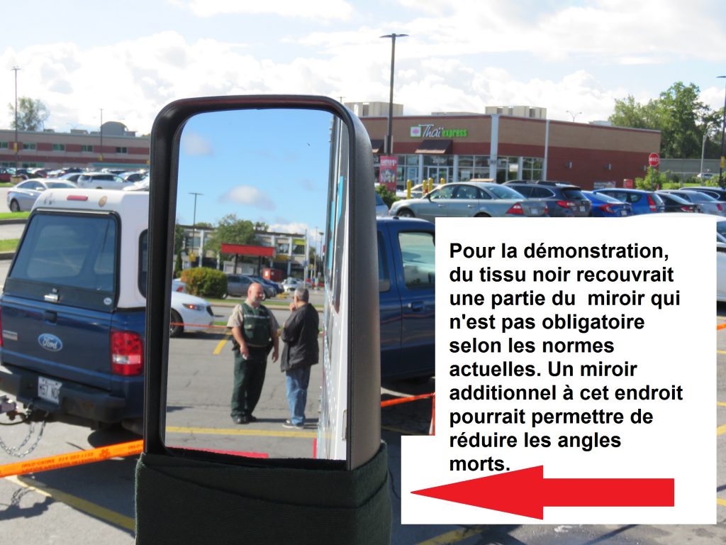 Le tissu noir au bas du miroir de l’illustration plus haut cache un autre miroir (généralement convexe, qu’on ne voit évidemment pas sur la photo) qui pourrait permettre de mieux voir les angles morts, mais cet autre miroir n’est pas obligatoire selon les règlements actuels.