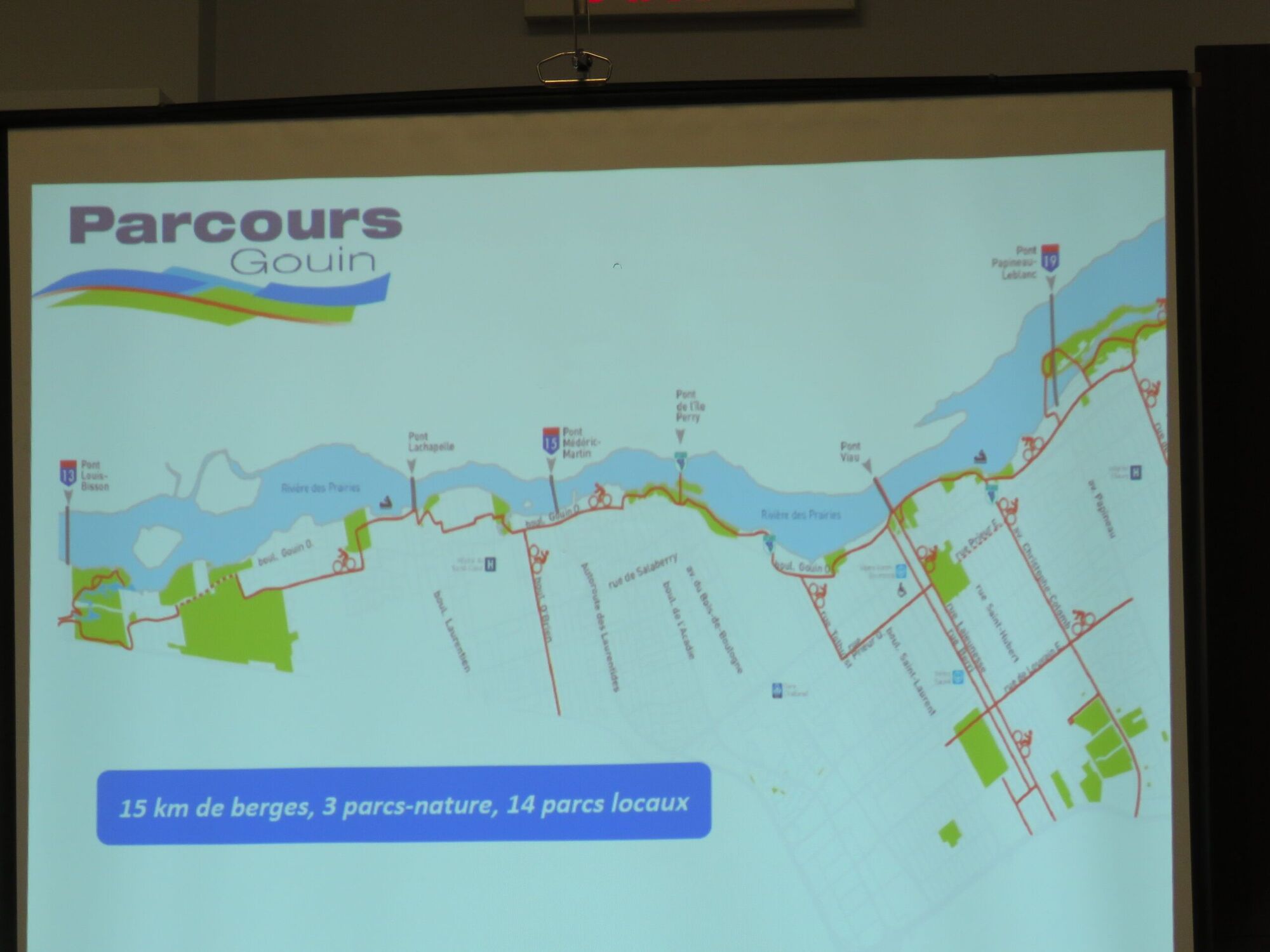 Les 70 citoyens présents ont eu droit à un survol rapide des événements récents et de ceux à venir concernant les 15 kilomètres du Parcours Gouin qui longent en grande partie la berge de la rivière des Prairies, de Montréal-Nord à Pierrefonds.