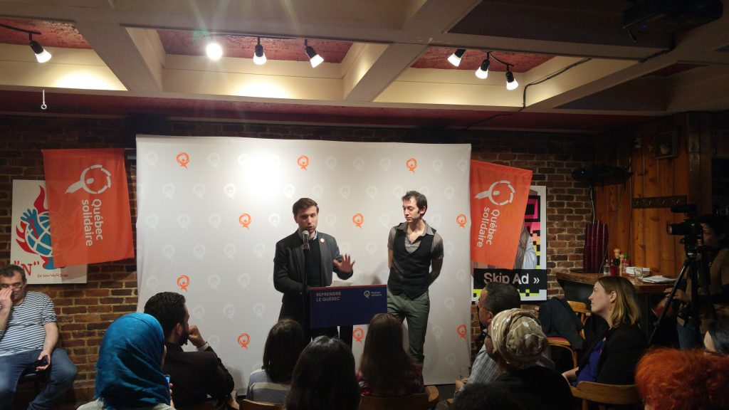 Raphaël Rebelo, depuis trois ans de toutes luttes sociales dans le Nord de la ville, était visiblement ému à l’annonce du résultat devant 125 personnes enthousiastes au pub Le brouhaha, sur Fleury est. Étaient aussi présents, plusieurs candidats de QS de la région et le député de Gouin, Gabriel Nadeau-Dubois, qui incidemment, se trouvait à un coin de rue du collège privé qu’il a fréquenté au secondaire, Regina-Assumpta.